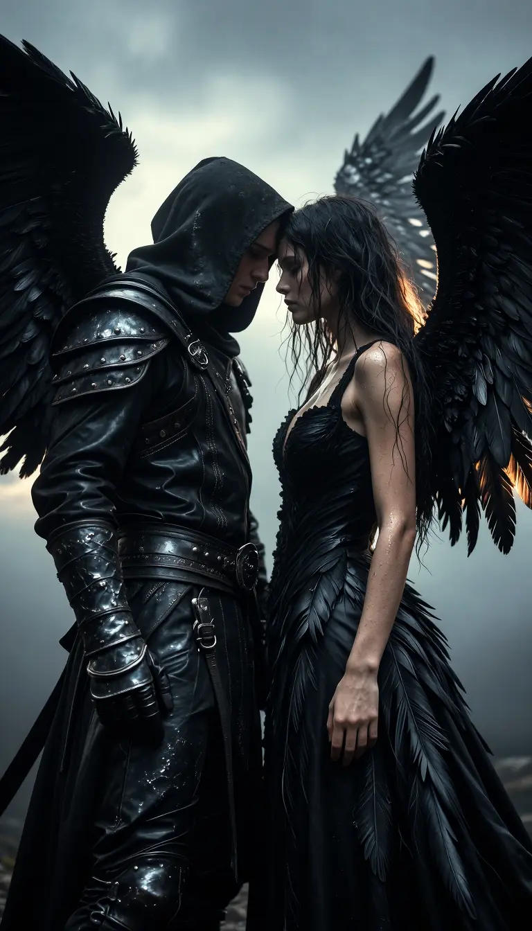 Two dark, fallen-angel figures standing forehead-to-forehead in a dramatic vertical composition, cinematic dark fantasy scene; a hooded male in layered black leather and armored gauntlets with textured straps and ornate belt faces a lithe female in a sculpted, wet-look black gown whose surface blends organic feather-like ridges with fabric folds. Both have large black wings with individually detailed feathers, tattered trailing edges, subtle metallic highlights and matte blacks. Moody overcast sky behind them casts soft backlight and rim-lighting along the wings and silhouettes, creating deep shadows and luminous edges. Close, intimate pose, lowered eyes, tension and sorrow. Ultra-detailed textures: scratched leather, worn metal buckles, micro-feathers, stray hair strands, damp fabric sheen, realistic skin shading and pores. High contrast, desaturated palette with cold blues and warm highlights, volumetric fog, subtle film grain, shallow depth of field, sharp focal plane on faces and upper torsos, photorealistic dark fantasy illustration with epic, moody atmosphere.