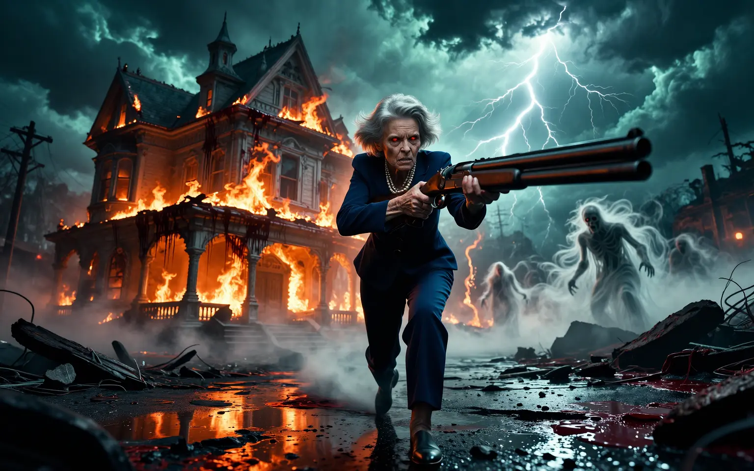A hyper-detailed cinematic horror illustration of an older woman with short silver-blonde hair and a stern, snarling expression, glowing red eyes, wearing a navy pantsuit and pearl necklace, charging forward while aiming a large double-barrel shotgun toward the viewer. Behind her, a crumbling Victorian building is engulfed in roaring orange flames and dripping with dark, blood-like stains, while stormy teal clouds and jagged lightning crack the sky. Ethereal white ghosts and a skeletal, red-eyed ghoul emerge from swirling fog and rubble. Foreground splattered blood, wet reflections on broken pavement, charred debris, twisted power lines, and ominous backlighting create dramatic rim light and deep shadows. Comic-book realism, ultra-detailed textures, high contrast color grading (teal and orange), dramatic low-angle wide lens composition, cinematic volumetric fog, dynamic motion blur, intense atmosphere, 4k, photorealistic yet stylized horror art.