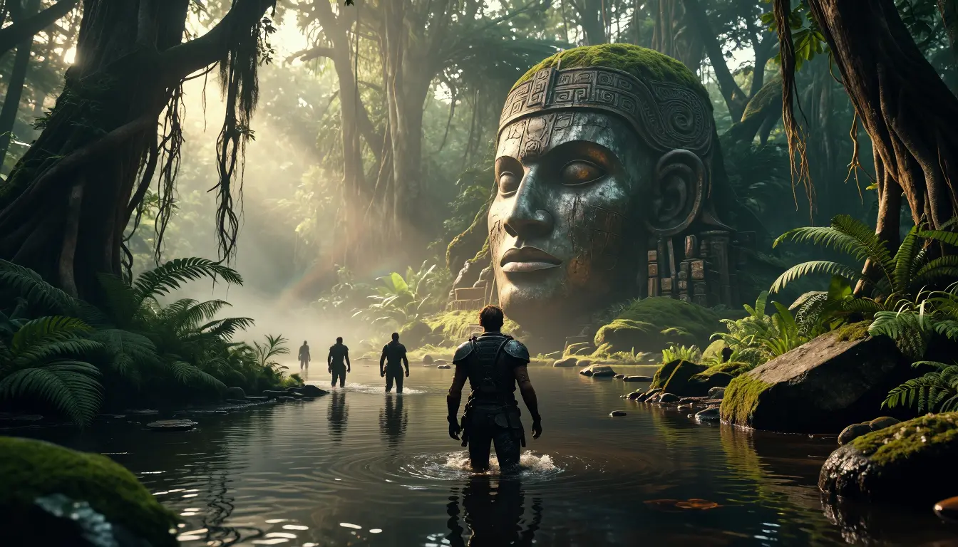 Cinematic wide-angle panoramic scene of a misty primeval jungle swamp at golden hour, low camera placed at water level looking toward a monumental moss-covered stone/metal giant head half-buried on a sunlit island, colossal trunks and hanging vines rising into soft volumetric light and green-gold god rays. Three armored explorers wade through shallow reflective water toward the ruin — one in the foreground back to camera, two midground at different distances — their silhouettes rim-lit, wet armor detailed with scratches and mud. Lush tropical vegetation: palms, ferns, broad-leaf plants, moss, lichen, and broken stone fragments scattered around. Rich, natural palette of deep emeralds, olive, muted browns and warm sunbeams, soft atmospheric fog, subtle rainbow prism in mist. Textures extremely detailed: damp bark, slick stones, corroded metal, ornate ancient carvings on the ruin. High dynamic range, photorealistic, ultra-detailed, shallow depth-of-field with crisp midground focus, pronounced depth, dramatic cinematic mood, realistic reflections and caustics on water, soft filmic grain.