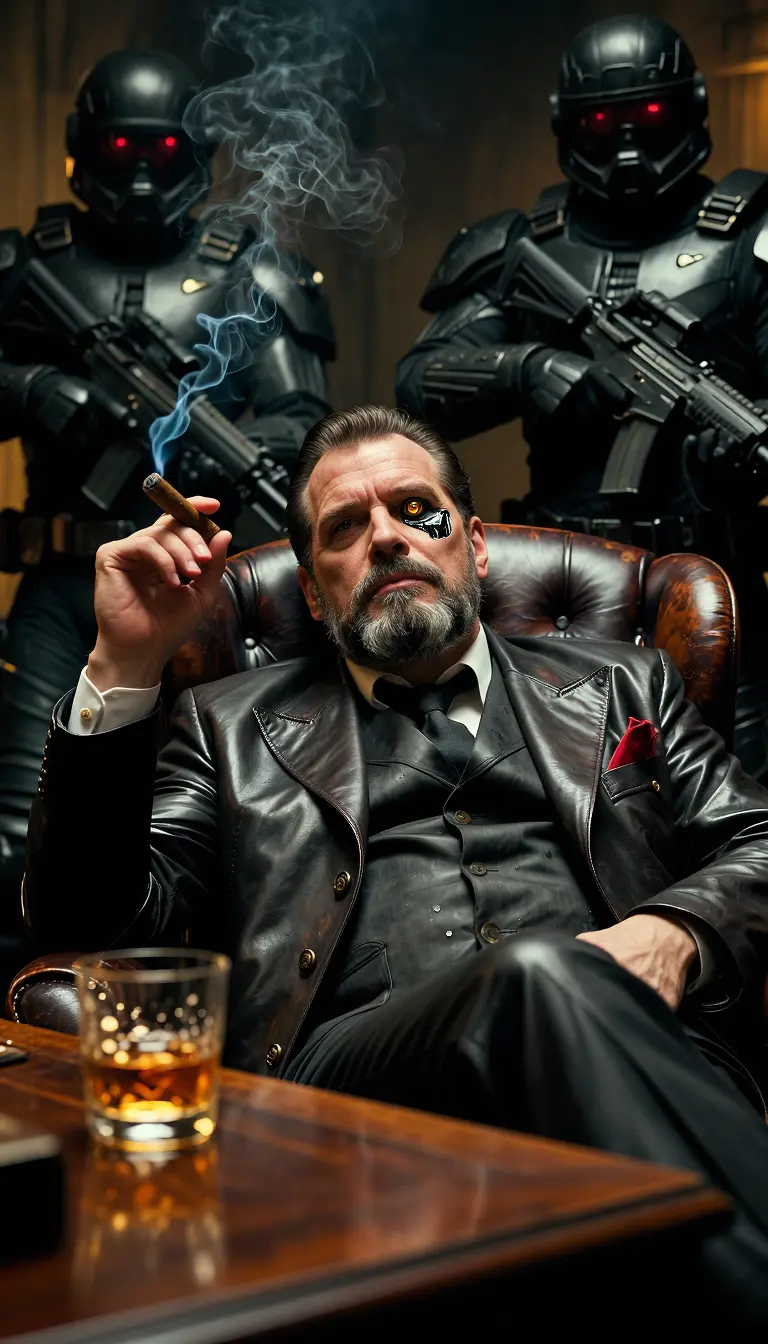 A cinematic photorealistic scene of a powerful, middle-aged crime lord seated in a worn leather executive chair, leaning back with a confident, inscrutable expression, holding a lit cigar that curls smoky tendrils into the air; he has a subtle cybernetic implant glowing amber around one eye, a trimmed grey beard, and a slight paunch visible beneath a tailored dark leather suit with a red pocket square and brass accents. A short glass of whiskey sits on a polished wooden desk in the foreground, warm reflections and condensation visible. Two imposing armored bodyguards stand behind him in matte black futuristic combat armor with red glowing visors and heavy rifles, slightly out of focus. Moody low-key lighting with dramatic rim and warm amber key highlights, smoke-filled atmosphere, rich textures of leather, metal, and wood, cinematic depth of field, detailed skin pores, fabric stitching, and reflective surfaces, film grain, high dynamic range, gritty neo-noir color grading, 35mm cinematic composition, ultra-detailed, hyperreal.