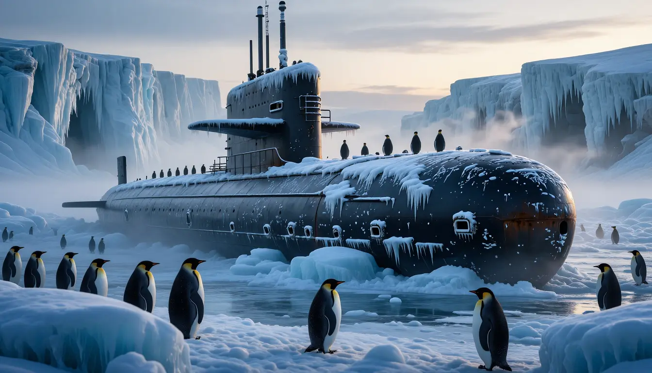 A massive abandoned military submarine, encrusted with thick ice and frost, lies stranded in a frozen polar landscape, half-buried in snowdrifts and surrounded by towering jagged ice cliffs; hull detailed with chipped dark paint, rust streaks, frost patterns, and long icicles hanging from the conning tower and deck fittings, open vents and hatches rimmed with snow; a colony of emperor penguins scattered across the scene—several in the foreground on a snow mound for scale, others climbing along the hull and dotted across icy crevices; soft cold blue cinematic dawn light with subtle warm rim highlights, gentle backlighting creating glints on ice, volumetric mist and light snow flurries, blowing wind textures and visible breath; ultra-detailed photorealistic rendering, micro-textures on metal and snow, realistic shadows, wide-angle low perspective emphasizing the submarine’s length, shallow depth of field foreground sharp, background fading into mist, dramatic composition, high dynamic range, muted cyan-blue color grading, cinematic atmosphere.