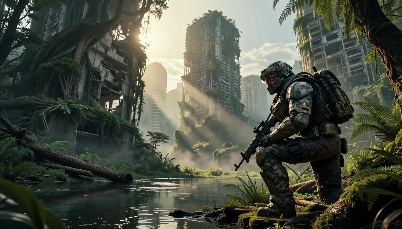 Post-apocalyptic overgrown cityscape at golden hour, towering ruined skyscraper reclaimed by jungle with massive trees and vines growing through shattered facades, soft volumetric sunlight shafts piercing mist and dust, reflective swamp water in the foreground with small ripples, fallen logs and scattered debris, dense ferns and wet moss framing the scene, hyper-detailed futuristic tactical soldier crouched at right foreground wearing worn armored exosuit with matte camo, red glowing visor, backpack and mounted rifle, mud and moss on boots, tense observational pose, cinematic composition with strong depth and scale, dramatic atmospheric particles, high-resolution photorealism blended with painterly concept-art styling, muted green and earthy palette with warm rim-light highlights, rich texture detail on concrete, metal, vegetation, dynamic range, 16:9 cinematic framing