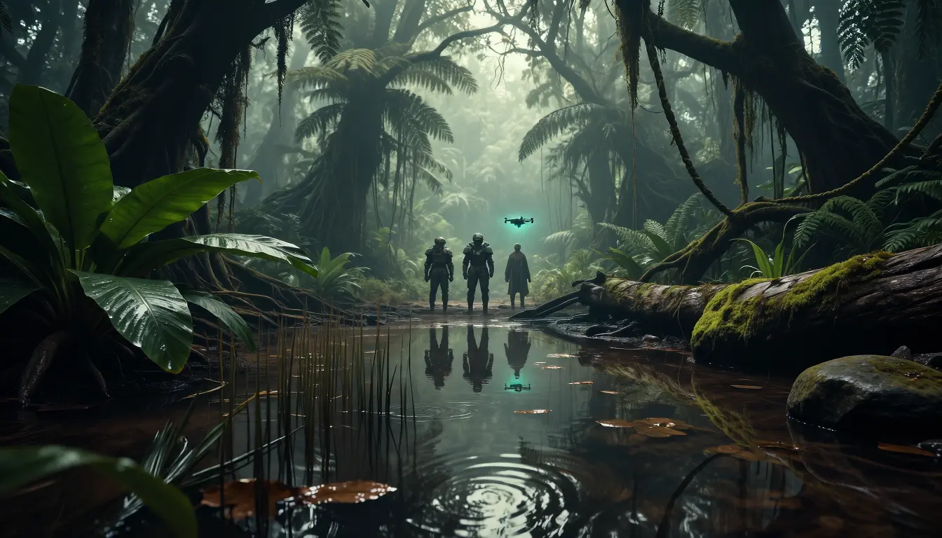 Panoramic, cinematic scene of a misty tropical swamp at dawn: a wide, shallow reflective pool in the foreground with thin reeds, floating leaves and ripples, framed by large wet broadleaf plants left and a moss‑covered fallen log and stone right, low hanging ropes and vines cutting across the scene. Dense, overgrown jungle beyond with tangled roots, huge ferns, hanging moss and twisted branches, shafts of diffused greenish light piercing volumetric fog. Three explorers stand on the muddy shore center‑distance — two armored humanoid figures in weathered futuristic suits and one figure in a long cloak, accompanied by a small hovering drone emitting a soft teal glow — all reflected faintly in the water. Moody, mysterious atmosphere, high detail, wet textures, realistic moss and bark, soft film grain, dramatic color grade of deep greens, muted browns and teal accents, ultra‑realistic, high resolution, wide-angle cinematic composition.