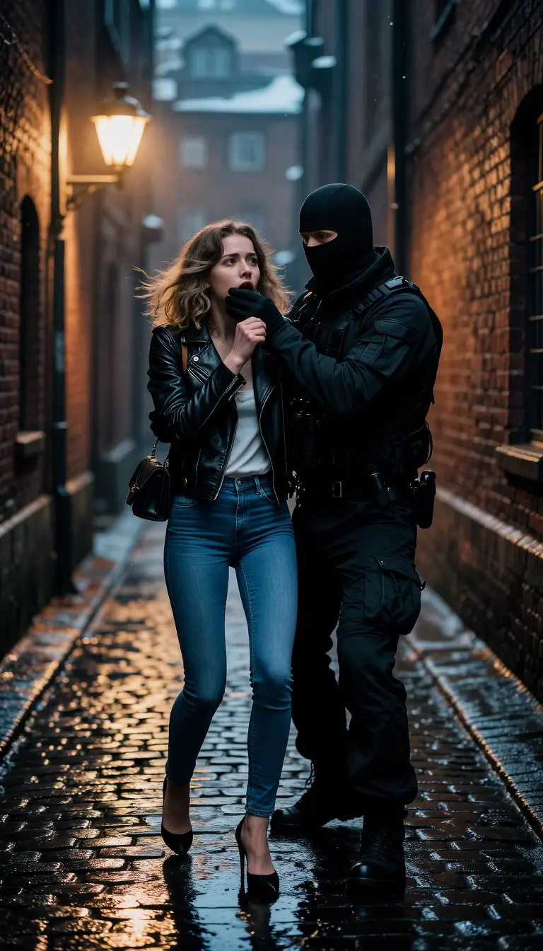 Cinematic photorealistic nighttime alley scene showing a tense abduction: a masked assailant in all-black tactical clothing and a balaclava holding a young woman from behind, one gloved hand clamped over her mouth while the other restrains her torso; she wears a black leather jacket over a white top, high-waisted skinny blue jeans, black stiletto heels and a small shoulder bag, body slightly twisted and anxious expression visible despite the hand; narrow cobblestone lane wet with recent rain reflecting warm amber light from a vintage wall lamp on the left, tall brick buildings framing the scene, light snow or dust motes drifting in the cool air; dramatic rim and fill lighting with deep shadows, cool blue ambient tones contrasting warm lamp glow, shallow depth of field, high-detail textures on leather, denim, brick and wet stones, off-center three-quarter full-body composition, low-angle 35mm cinematic perspective, high dynamic range, film noir mood, subtle motion blur and atmospheric grit for realism.