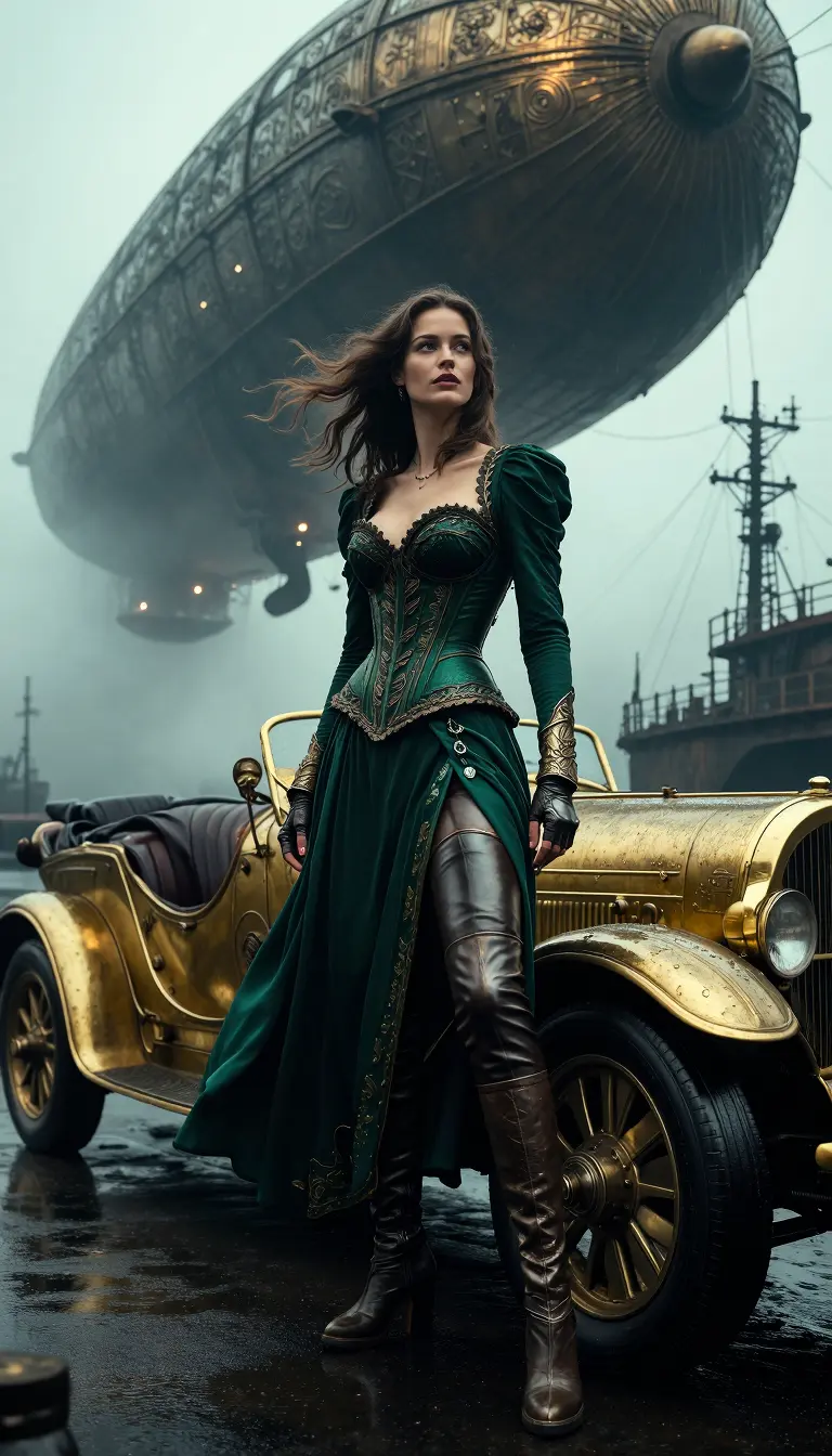 A cinematic, photorealistic steampunk scene: a tall woman stands confidently in front of an ornate vintage brass and gold car on wet, reflective asphalt as fog swirls over an industrial harbor; she wears a form-fitting, dark green corset dress with intricate metallic leaf and filigree trim, a high slit revealing leather leggings and thigh-high boots, fingerless gloves with brass accents, her hair and dress gently fluttering in the wind. Behind her, massive, detailed airships float in the misty sky, their hulls covered in etched metal panels and soft, warm light, while industrial piers and overhead cables dissolve into the fog. Dark, overcast lighting with warm highlights on the edges of brass, volumetric fog, raindrops on metal surfaces, high dynamic range, ultra-detailed textures on fabric, leather, and metal, cinematic color grading with an emphasis on deep emeralds, muted turquoise grays, and rich golds, shallow depth of field with sharp focus on the subject, low-angle three-quarter composition, ultra-high resolution, and film grain for realism.