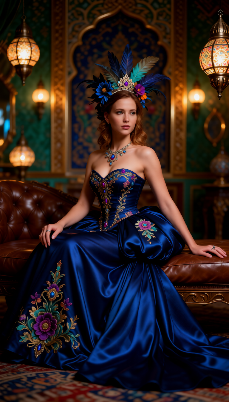 A regal woman adorned in a voluminous, strapless midnight blue satin gown, intricately embroidered with opulent floral motifs and jewel-toned embellishments, is seated on a rich brown leather chaise lounge. The gown's dramatic silhouette cascades around her, featuring a voluminous, gathered skirt with flowing train. She wears an elaborate headdress of feathers and exotic flowers, a statement necklace, and delicate rings. The backdrop is a luxurious, richly decorated interior, reminiscent of an opulent Arabian or Persian palace, with ornate gilded frames, detailed tapestry-like wall hangings in deep emerald green and sapphire blue, and decorative Moroccan lanterns casting a warm, ambient glow. The atmosphere is one of grandeur, mystery, and sophisticated opulence. The lighting is soft, directional, and theatrical, creating dramatic shadows and highlighting the textures of the satin and embellishments. The color palette is dominated by deep blues, greens, purples, and golds, with rich earthy tones from the leather and wood. The composition is a medium shot, with the woman as the primary focal point, her gaze directed slightly away from the camera, exuding poise. The depth of field is shallow, softly blurring the background to emphasize the subject. The artistic style is haute couture fashion photography with a touch of surrealism and historical fantasy. --style raw --ar 16:9 --v 6.0