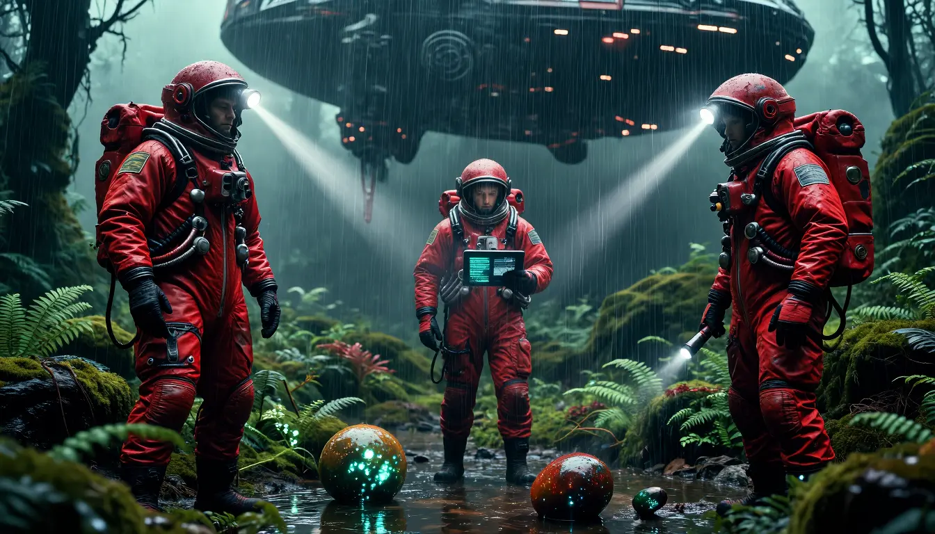 Three astronauts in worn red deep-space suits stand in a moss- and fern-covered alien clearing in a pouring rain. Beams from helmet-mounted headlamps and a hand-held flashlight pierce the voluminous rain and fog. High-tech life support systems, exposed cables, and worn armor plates with scratches, scuffs, and mission patches are visible. One reads data on a holographic tablet, the other points a hand-held flashlight at the ground. A massive, dark ship hovers low above them, its faint circular emblem and its sidelights piercing the downpour. In the foreground, wet mud and bioluminescent plants glisten near strange, capsule-like objects partially submerged in water. Cinematic photorealism, dramatic low lighting, a rich green-turquoise palette contrasting with the vibrant red spacesuits, hyper-detailed textures, visible raindrops, reflections, atmospheric depth, wide-angle composition, shallow depth of field, hyper-realistic clarity, and a dark sci-fi atmosphere.