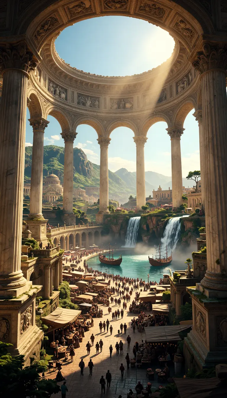 Epic, hyper-detailed scene of an ancient, colossal circular colonnade with towering Corinthian marble columns and a massive oculus framing a bright blue sky filled with soft clouds, sunlight beaming through creating dramatic volumetric light rays and warm golden highlights on carved friezes and statues; a vast terraced city cascades below with red-tiled roofs, bustling markets, crowds of tiny figures, sailboats on a serene turquoise river and multiple waterfalls plunging into a lagoon, distant mountains and layered aqueduct-like arcades receding into atmospheric haze, intricate stone weathering, moss and vines, reflections on water, cinematic wide-angle vertical composition, ultra-realistic textures, high dynamic range, crisp fine detail, sweeping depth, majestic, awe-inspiring mood.