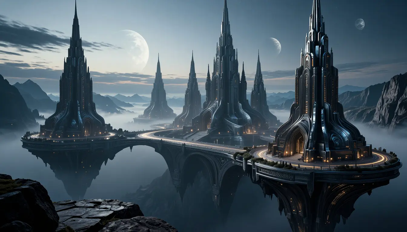 A vast, otherworldly mountain city at dusk, featuring colossal spired towers rising from a floating basalt platform with sweeping archways and intricate futuristic-gothic ornamentation, polished dark stone and chrome surfaces reflecting cold blue light; a serpentine illuminated highway with warm lamplights threads through mist-filled valleys and onto the platform, tiny glowing windows and scattered beacons peppering the structures, massive pale planet and two smaller moons hanging low in a cloud-streaked sky; dramatic cinematic lighting, deep atmospheric fog, high contrast rim light on jagged peaks, ultra-detailed textures, sweeping wide-angle composition, low-angle perspective emphasizing scale, crisp foreground rock details, soft depth of field toward distant towers, moody serene color palette of slate blues and silver, epic, mysterious, hyperreal.