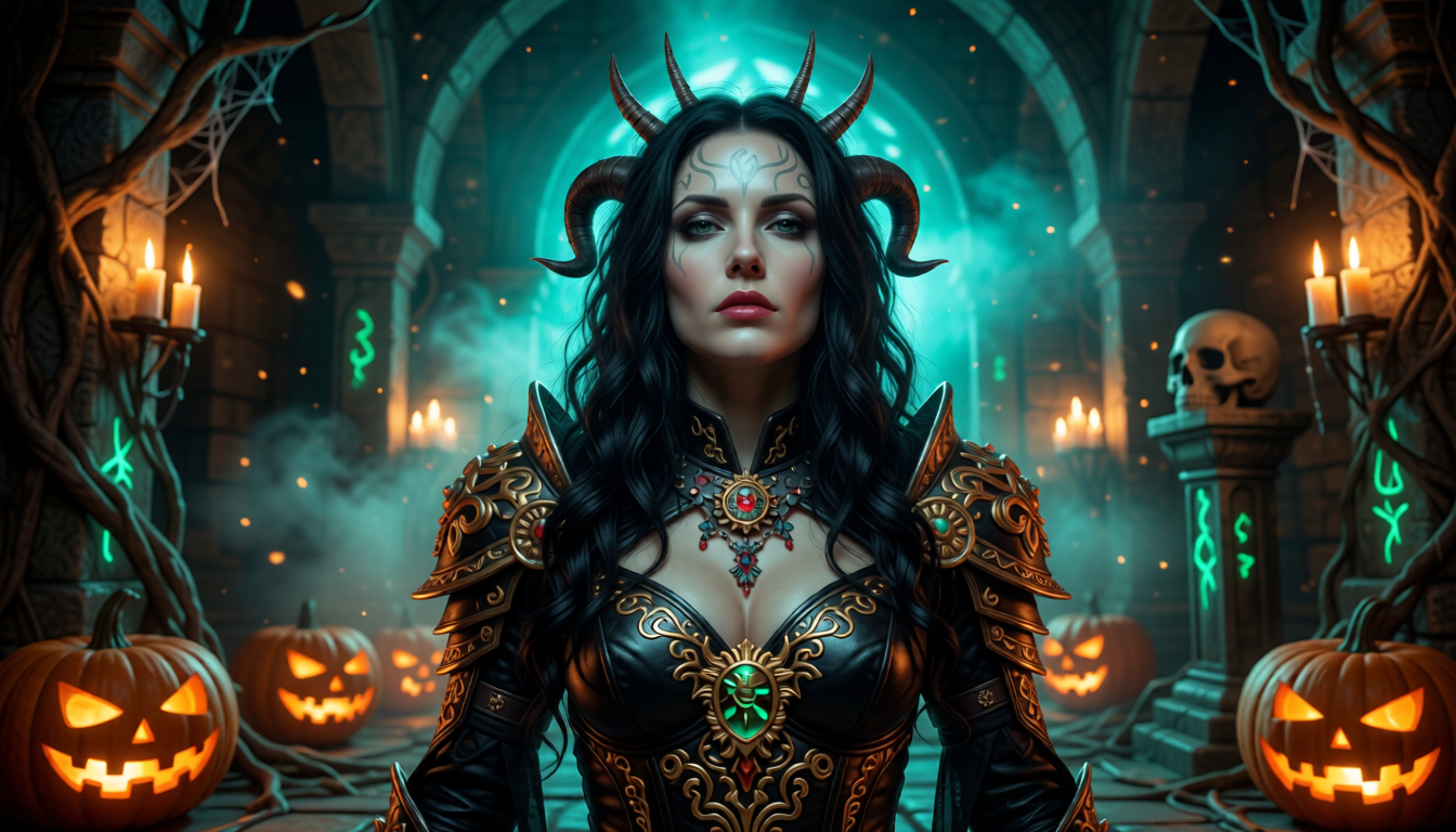 A dark gothic fantasy portrait of a demonic sorceress standing in the center of a candlelit crypt, composition from the bottom up emphasizing power and menace, porcelain skin and long wavy black hair intertwined with small curved horns and spiky antennae, piercing languid gaze and high cheekbones, subtle magical markings on the forehead, revealing black leather armor with gold filigree and an ornate crest brooch on the chest, sculpted shoulders and intricate jewelry, dramatic turquoise green backlighting and the warm amber glow of a jack-o-lantern create strong rimlighting and deep shadows, volumetric fog and drifting particles, ambient details include carved pumpkins, a weathered skull on a column, entwined roots, cobwebs, ancient stone architecture and subtle green runes, highly detailed fabric, metal and stone textures, ultra-detailed photorealism, impressive small Depth of field (85mm, f/1.8), sharp eyes, soft skin shadows, high dynamic range, cinematic color grading, fantasy-religious atmosphere, expressive and majestic.