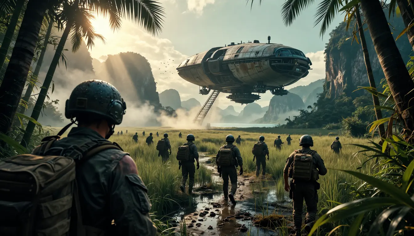 Cinematic photoreal scene of a tropical coastal jungle battlefield at golden hour, vast panoramic 2.39:1 composition framed by foreground palm fronds and bamboo, over-the-shoulder view of a scarred soldier helmet and tactical pack in sharp focus on the left, midground a small squad of soldiers advancing through wet marsh and tall grass with cautious movement, background towering karst islands and cliffs shrouded in mist. A massive futuristic dropship hovers low, weathered hull, landing ramps and external weapon mounts visible, rotor wash kicking up dust, water spray and fog, birds scattering in its wake. Moody teal-and-gold color grade, volumetric light rays cutting through mist, high contrast with soft rim light on metal and foliage, subtle film grain, shallow depth of field with strong atmospheric perspective, realistic textures: muddy footprints, scuffed armor, wet vegetation, condensation on helmets. Epic, tense, hyper-detailed, cinematic concept art quality, 24mm ultra-wide lens feel, f/4, warm backlight, dramatic scale and depth.