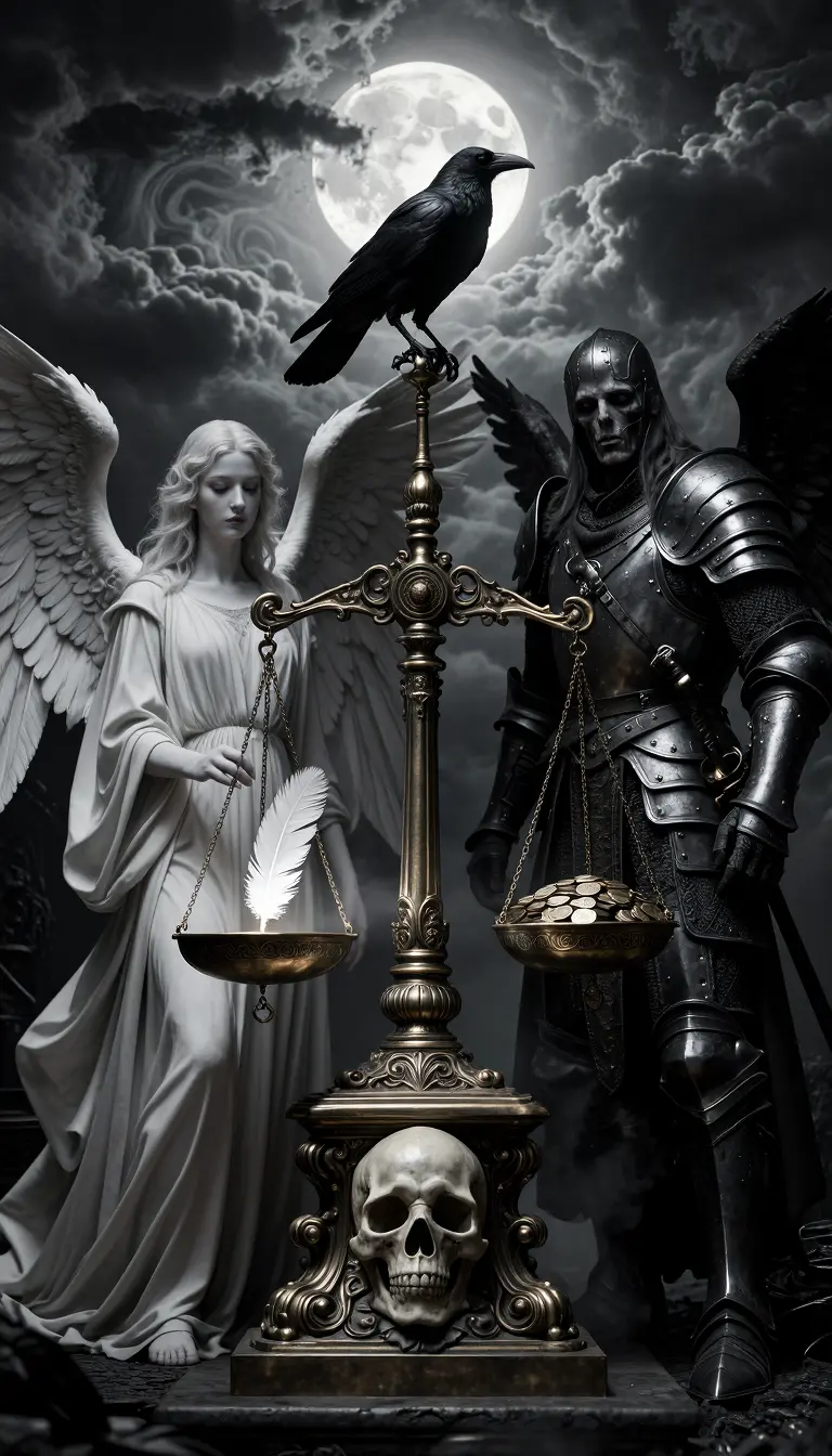 Hyper-detailed gothic fantasy scene, symmetrical composition centered on an ornate bronze scale standing on a sculpted plinth with a human skull at its base, full moon and swirling storm clouds in the background, dramatic chiaroscuro lighting and volumetric moonlight. Left: a serene angel with flowing robes and large feathered wings, pale skin, delicate features, holding the left pan containing a single glowing white feather. Right: a brooding armored fallen warrior in dark battered plate, gaunt face, holding the right pan overflowing with coins. A raven perches atop the scale, tense atmosphere, subtle mist around figures. Intricate metal filigree, realistic feather and fabric textures, high contrast monochrome palette, cinematic, hyperreal digital painting, ultra-detailed, 8k, dramatic rim lighting, soft film grain.
