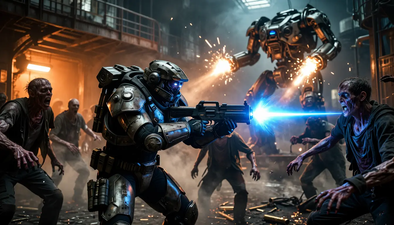 A cinematic, hyper-detailed action scene inside a dim industrial complex: a heavily armored future-soldier in powered exoskeleton combat armor fires a bright blue energy weapon into a snarling horde of undead, glowing visor, scuffed metal plates, exposed hydraulic joints, ammo boxes and tactical pouches; battered humanoid zombies with torn clothes and mottled skin reach and claw at the soldier, veins and torn flesh visible, desperate poses. Two larger bipedal mechs in the background unleash suppressing fire, muzzle flashes and hot brass, sparks and debris fly, catwalks and metal railings above, warm orange backlight contrasts with cold blue rim lights, thick volumetric smoke and dust, dramatic rim lighting and deep shadows, dynamic low-angle wide shot with slight motion blur, shallow depth of field, high-resolution photoreal texture, gritty grime, convincing reflections, cinematic color grading, high contrast, intense, visceral atmosphere.