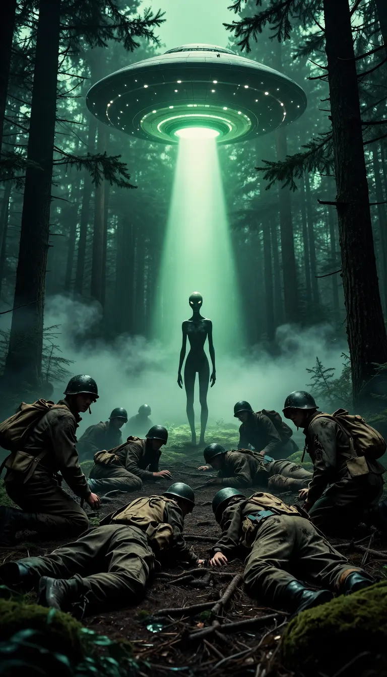 Vertical cinematic photorealistic scene: a dense, misty pine forest at night bathed in a sickly green light, a classic saucer-shaped UFO hovers low with concentric rings of bright white-green lights and a powerful cylindrical beam illuminating the forest floor, within the beam stands a slender humanoid alien with glowing eyes, elongated limbs and matte dark skin partially silhouetted by the backlight, a circle of fatigued soldiers in vintage helmets and backpacks kneel, crouch or lie wounded on root-strewn ground, faces shadowed, mud-streaked uniforms, torn fabric and detailed gear, tense body language and stunned expressions, thick volumetric fog, dramatic rim lighting and deep shadows, high contrast teal-green color grading, subtle film grain and cinematic HDR, ultra-detailed textures, low-angle perspective for epic scale, strong depth of field, eerie suspenseful atmosphere, moody movie-poster composition.