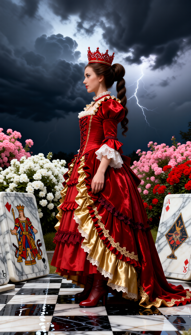Элегантная молодая девушка в образе Красной червовой королевы, использовать лицо с фотографии ,полный рост, профиль/3-4 поворот, спокойное серьёзное выражение лица. На голове роскошная красная корона с филигранью, высокая причёска (пучок/косы). Пышное винтажное викторианское платье с корсетом,красного цвета, многослойной юбкой, рюшами и кружевом, цветовая гамма красное/золото/мраморная текстура. Вокруг гигантские мраморные карты всех мастей фигуры (король, дама, валет, туз), шахматная плитка под ногами, мокрый блеск. Фон: тёмное драматичное небо, грозовые облака, розовые кусты белых, красных р...