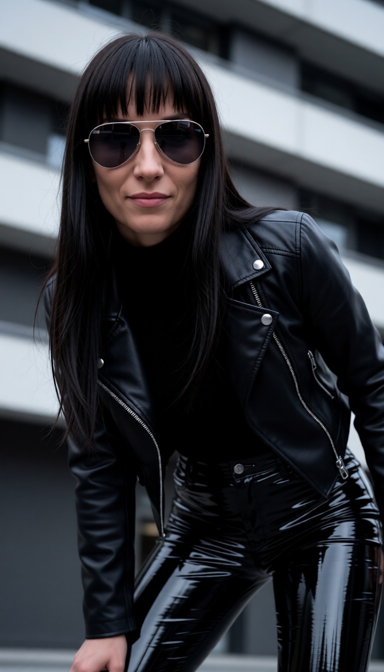 A striking young woman with long, dark hair and large aviator sunglasses poses confidently, leaning forward. She wears a black leather biker jacket over a black turtleneck and high-waisted, glossy black vinyl pants. The style is edgy and fashionable, with a mood of cool sophistication. The lighting is somewhat diffused but highlights the textures of the leather and vinyl, creating a dramatic contrast against the muted, horizontal lines of the modern building in the background. The color palette is dominated by blacks and grays, with subtle reflections in her sunglasses. The composition is a medium shot, with the woman filling most of the frame, captured from a slightly low angle that emphasizes her presence. The focus is sharp on the woman, with a shallow depth of field blurring the background. This image evokes a contemporary fashion editorial aesthetic, inspired by photographers like Helmut Newton. High detail, 8k resolution, ultra-realistic, cinematic lighting.