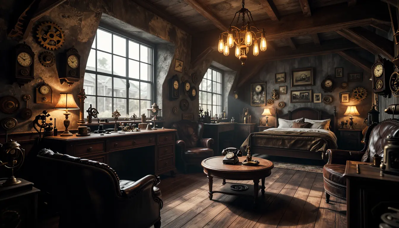 SUBJECT: A vintage steampunk study room, featuring a dark leather armchair in the foreground, a large wooden desk with various antique lamps and mechanical objects, a round coffee table with a rotary phone, and a bed in the background. The walls are adorned with numerous antique clocks, gears, and framed pictures. A prominent chandelier of Edison-style bulbs hangs from the ceiling.