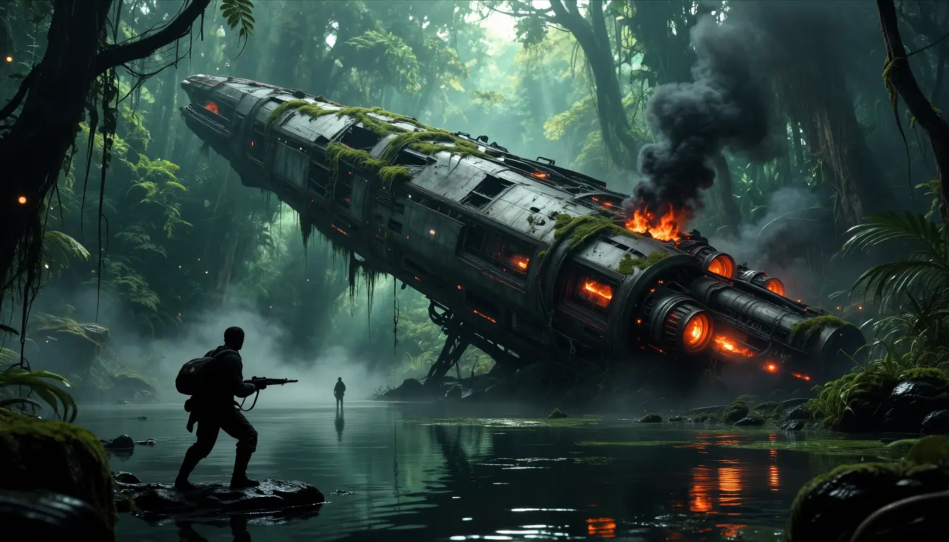 Massive crashed starship lodged diagonally across a misty jungle lagoon, broken hull panels peeled open, smoldering engines glowing with ember-orange heat and black smoke plumes, twisted mechanical ribs and dangling conduits encrusted with moss and vines; two lone figures—one a silhouetted scout in the foreground with a rifle and a faint red emblem on their pack, low stance on wet rocks, another small figure standing distant in shallow water—scale and solitude emphasized. Volumetric shafts of teal-green light pierce the dense canopy, illuminating drifting water vapor, falling debris, floating embers and rippling reflections on glassy, algae-streaked water. Hyper-detailed cinematic concept art, dramatic low-angle composition, deep focus, textured metal and weathered paint, realistic water caustics and wet surfaces, soft film grain, subtle lens flare, muted jungle greens and deep teals contrasted with charred blacks and fiery oranges, eerie post-apocalyptic atmosphere, high realism with painterly brushwork for foliage and smoke.