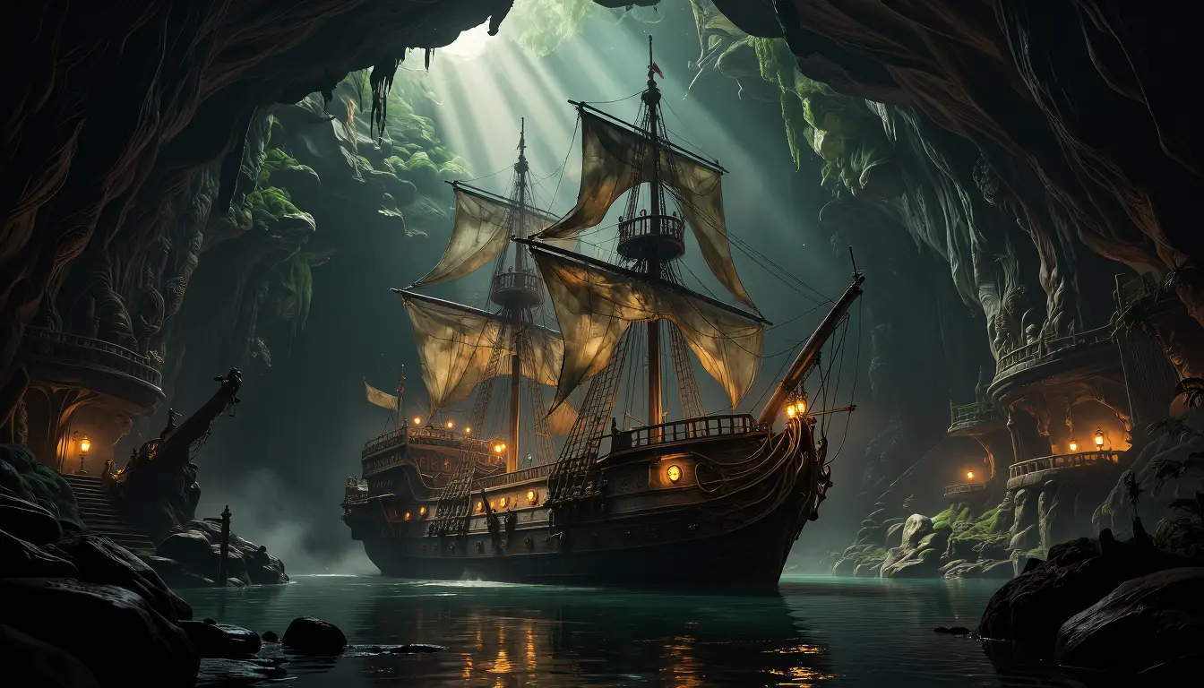 A grand, weathered galleon docked within a cavernous, overgrown harbor. The scene is rendered in a dark fantasy, painterly style with a strong sense of atmosphere. Rays of ethereal, god-like light pierce through openings above, illuminating dust particles and casting dramatic shadows across the water and rocky landscape. The color palette is dominated by deep greens, earthy browns, and muted blues, contrasted by warm, golden light emanating from the ship's lanterns and illuminating its decks and hull. The composition is cinematic, with the ship as the central focal point, framed by towering, organic rock formations and decaying man-made structures. A low-angle shot emphasizes the scale of the ship and the imposing environment. The overall mood is mysterious, ancient, and slightly foreboding. High detail, sharp focus, cinematic lighting, epic scale, concept art, digital painting, trending on ArtStation.