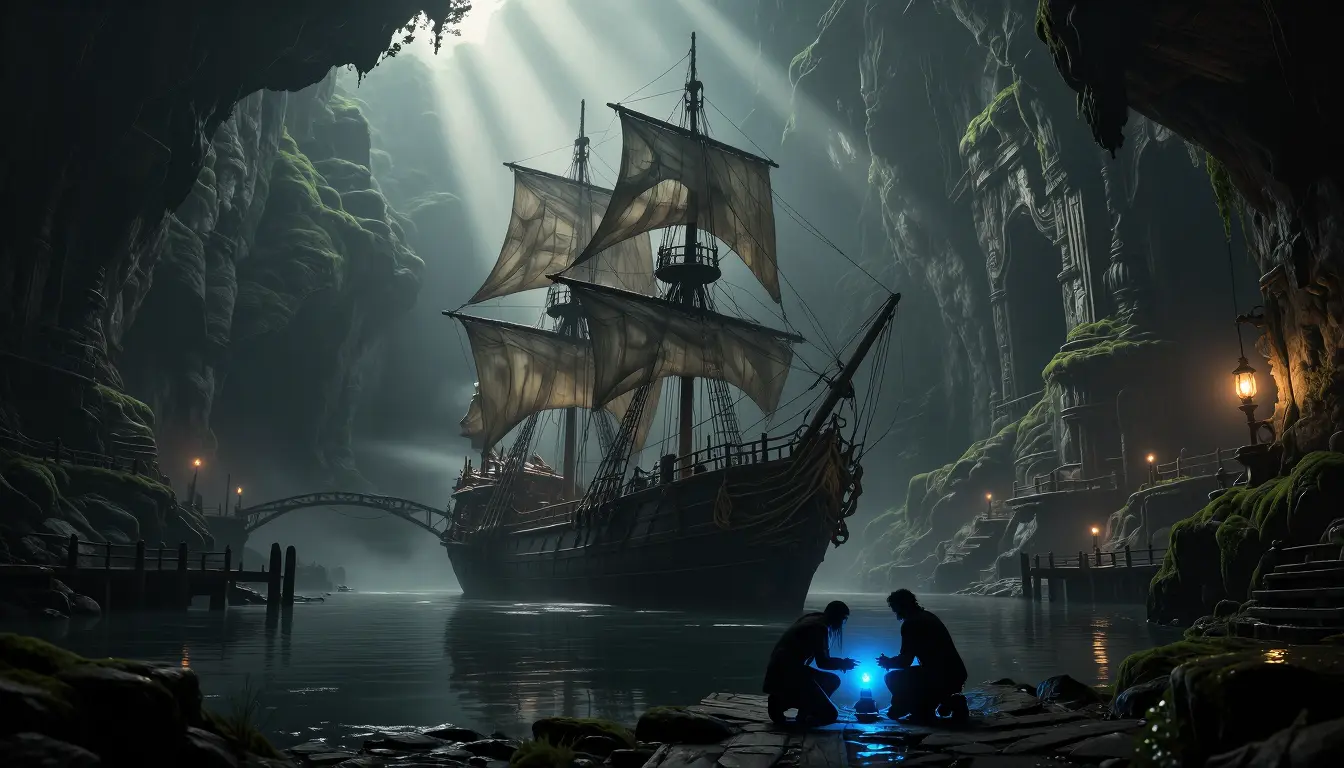 SUBJECT: A majestic, old-fashioned sailing ship with tattered sails, docked in a harbor. Two silhouetted figures are present in the foreground, one crouched and seemingly interacting with a glowing blue light source, the other kneeling beside them.