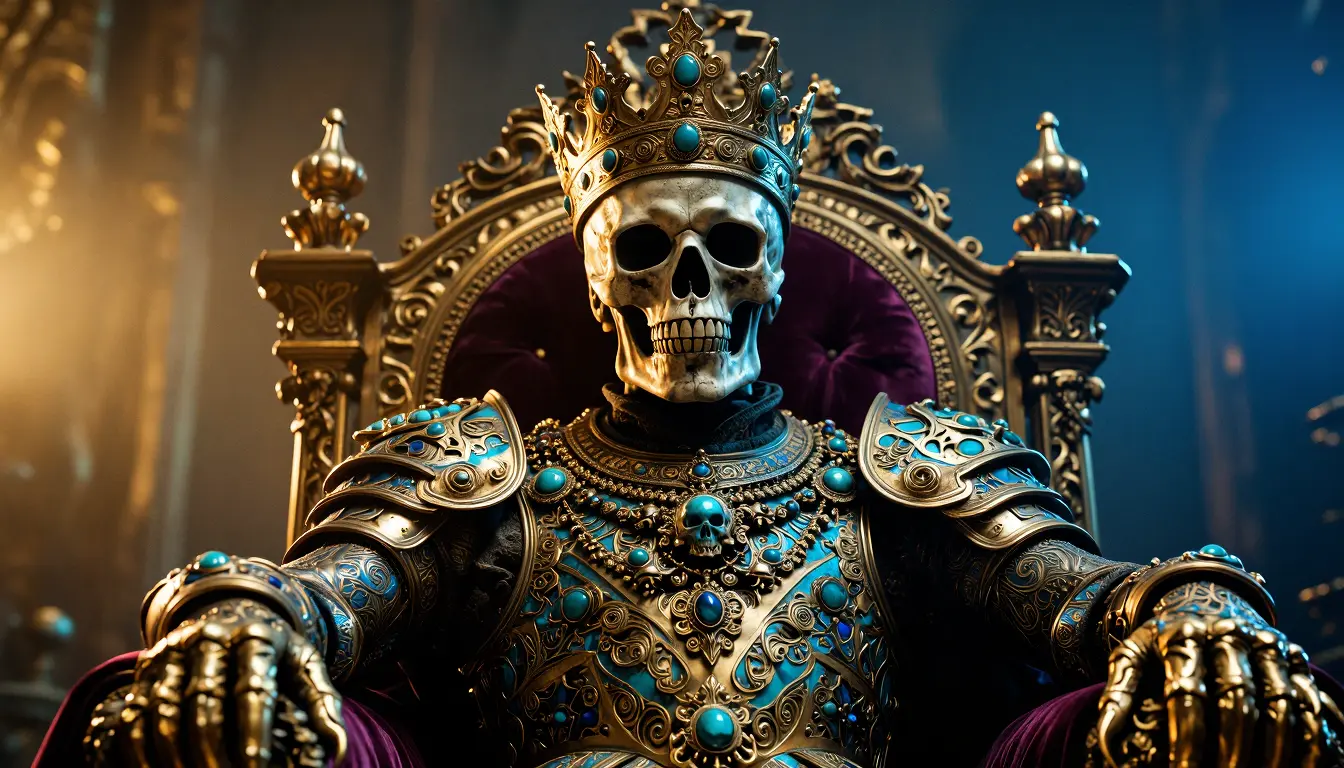 A hyper-detailed portrait of an undead king seated on an opulent throne, three-quarter low-angle view, regal skeletal face with a wide, menacing grin and deep shadowed eye sockets, wearing an elaborate gold crown inset with large turquoise cabochons and filigree spires; ornate baroque armor of burnished gold and teal enamel, heavy layered necklaces and chestplate with turquoise gems and skull motifs, gilt filigree gauntlets with long claw-like nails, richly textured velvet throne back blurred in shallow depth of field. Cinematic dramatic lighting: warm golden key light from the left highlighting metal reflections, cool blue fill from the right for contrast, subtle rim light to separate silhouette. Emphasize intricate engraving, microdetail in metalwork, realistic bone texture, polished gemstones, dust and wear for age, ultra-high resolution, photorealistic, shallow DOF, 85mm perspective, soft film grain, high dynamic range, moody majestic atmosphere.