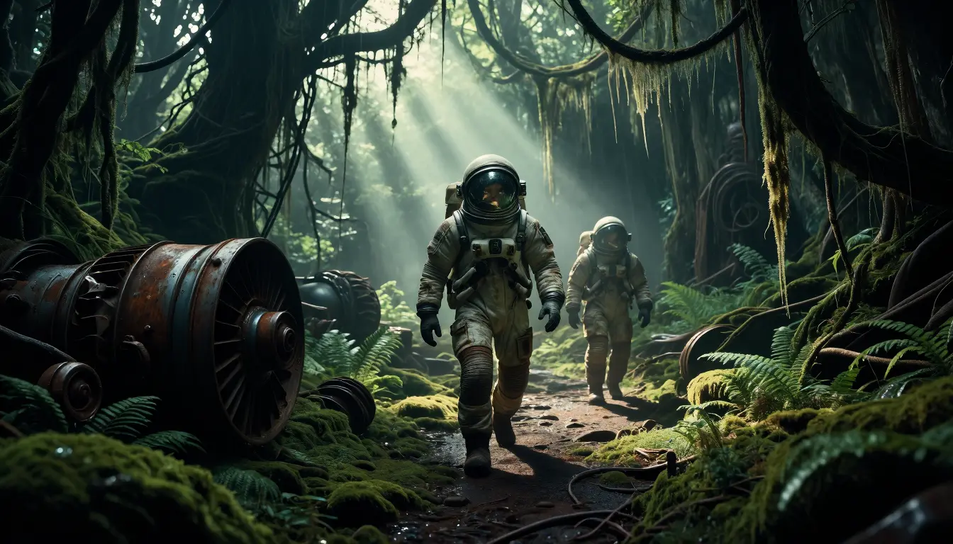 Cinematic, atmospheric panoramic scene of two explorers in worn space suits walking through a ruined, overgrown industrial cavern reclaimed by a dense temperate forest; shafts of soft, green-tinted sunlight pierce the canopy and hanging moss, illuminating the leading astronaut whose helmet visor reflects diffuse light and mist, while the second figure trails slightly behind casting long, soft shadows; foreground filled with thick moss, ferns, broken metallic turbine parts and rusted machinery entwined with roots and vines, slick surfaces with dew, frayed cables dangling from the ceiling; mood: mysterious, melancholic, awe-inspiring; color palette: deep greens, muted earth tones, touches of rust and cold metal; highly detailed textures, realistic materials, volumetric fog, subtle film grain, dramatic rim lighting, shallow depth of field near edges, wide-angle low perspective, high-resolution concept art suitable for a cinematic sci-fi matte painting.