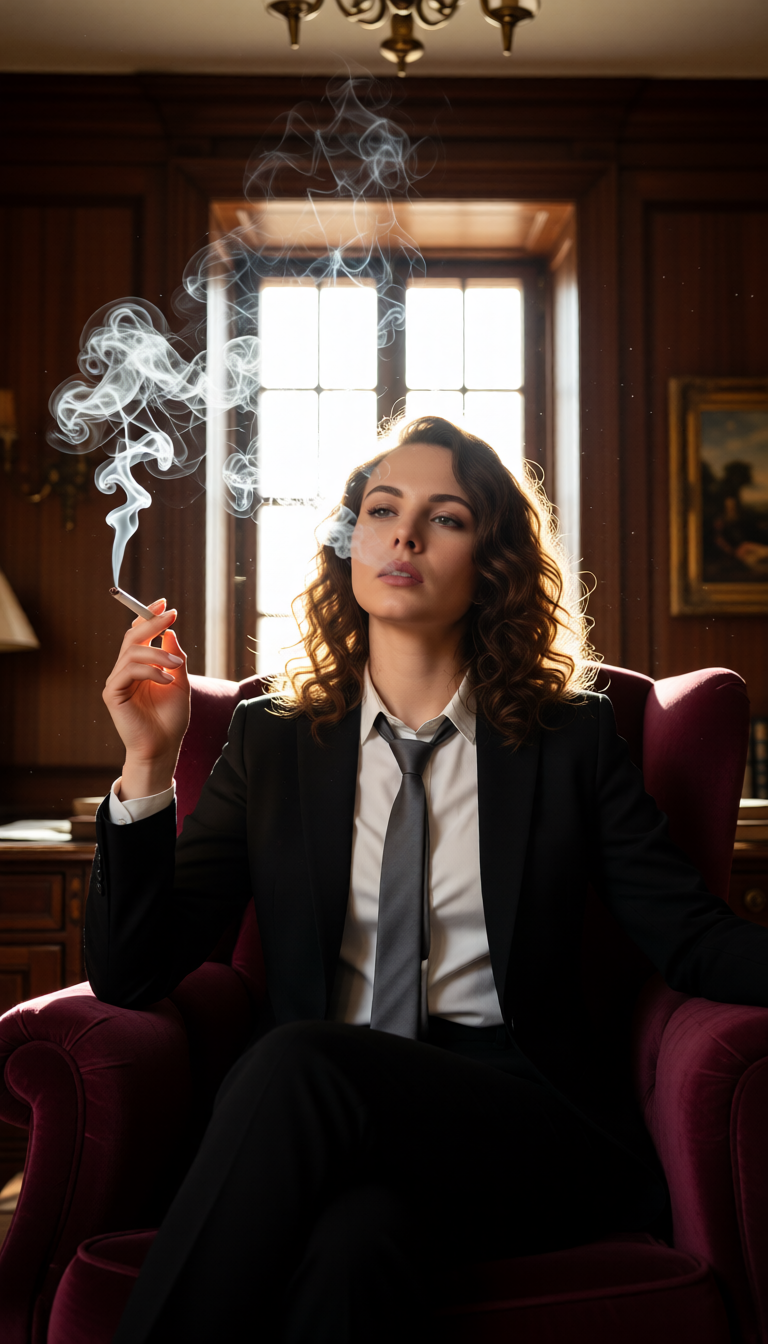 A high-definition cinematic portrait of a sophisticated woman sitting in a plush, velvet burgundy armchair within a sunlit, vintage study. She is wearing a sharp black tailored suit, a crisp white button-down shirt slightly unbuttoned, and a loosely tied charcoal grey necktie. She holds a cigarette, with thick, ethereal plumes of white smoke swirling dramatically around her face and rising toward the ceiling. The lighting is dramatic "chiaroscuro" style, with bright sunlight streaming through a large window behind her, creating a glowing rim light on her hair and the smoke. The background features ornate wooden wall panels and a classic framed painting. Photorealistic, 8k resolution, moody atmosphere.