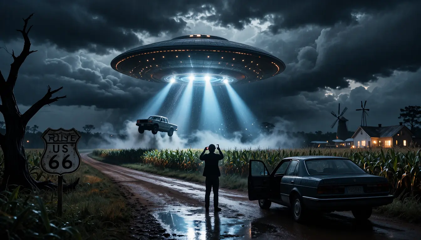 Cinematic photorealistic night scene on a rural dirt road after rain: a lone figure stands beside an open car door taking a photo with a smartphone, silhouetted against dramatic storm clouds; in the midground a large saucer-shaped UFO hovers low, casting multiple intense blue-white tractor beams that lift a white pickup truck into the air above a cornfield, particles and mist swirling in the beams. Atmospheric volumetric lighting, subtle lens flares, wet reflective puddles on the road, moody cool color palette with hints of warm farmhouse lights, distant windmill, farmhouse on the right, dead gnarled tree on the left, weathered Route US 666 sign, high detail textures, wide-angle composition, strong sense of scale, eerie suspenseful mood, ultra-detailed, high dynamic range, cinematic depth of field.