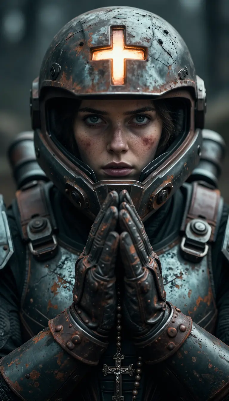 A cinematic close-up of a woman in battered, rusted Halo-style power armor, her helmet dominating the frame with a glowing cross-shaped cutout emitting a warm, smoldering light; her face partially shadowed by the visor, pale skin with freckles and a small bruise, her gaze intense and piercing; armored gloves covered in rust, rivets, and cracked paint, her hands clasped in prayer, holding an old metal rosary and an ornate crucifix, reflecting the warm light. Hyper-detailed photorealism, extreme close-up, shallow depth of field with soft bokeh in the background, highly detailed textures of metal, leather seals, and mechanical joints, minute scratches, soot, and rough surfaces. Somber, dramatic lighting with cool, desaturated grays and muted turquoise shadows contrasting with the copper and smoldering highlights of the cross, subtle film grain, voluminous dust and faint smoke particles, and soft rimlight accentuating edges. Centered and symmetrical composition, an emotional, stoic facial expression, tactile realism, macro detailing of materials, depth of field, focusing on the hands and rosary beads, cinematic color grading, ultra-detail, high dynamic range, and photorealistic rendering.