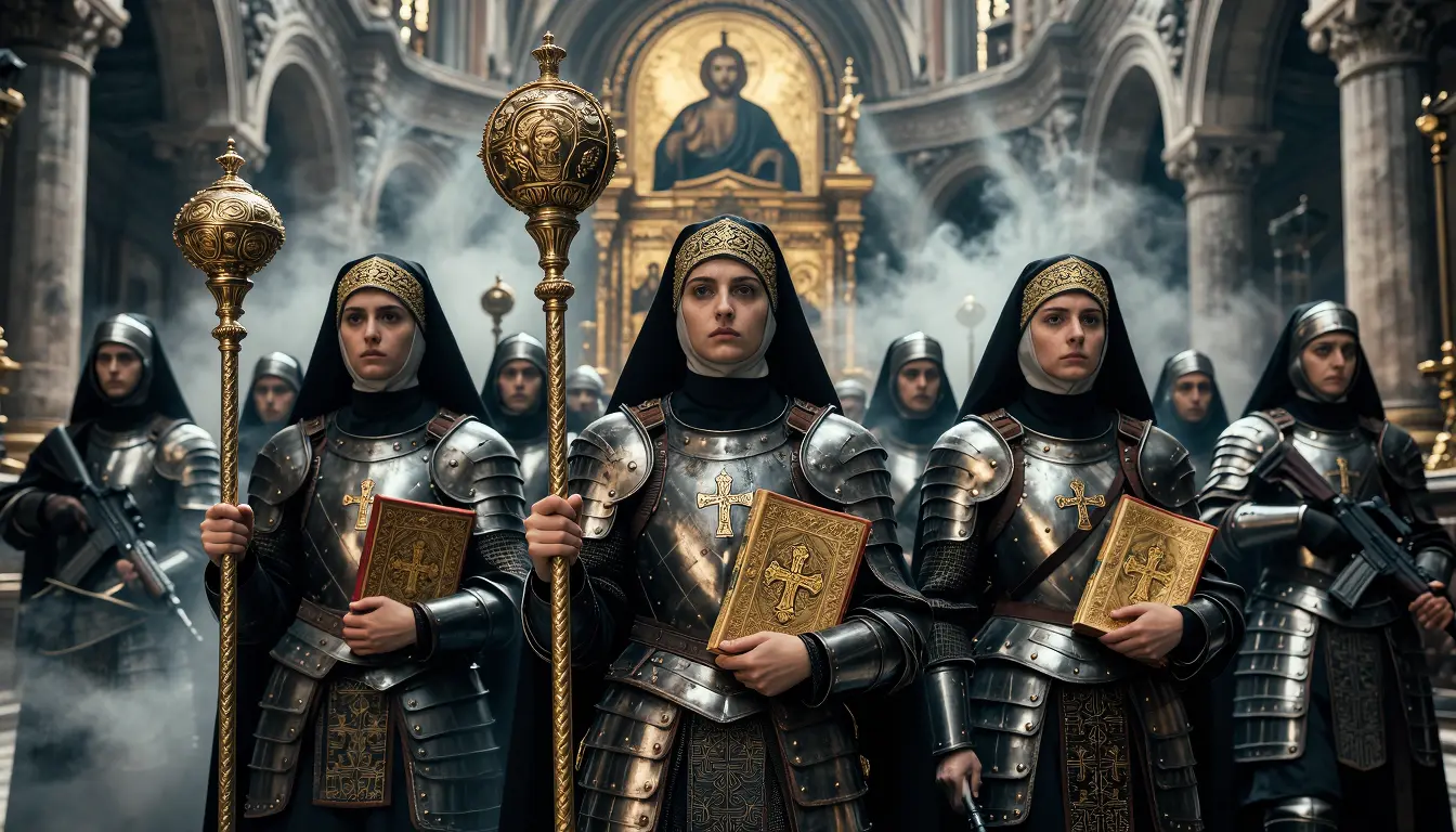 Ultra-detailed photorealistic scene of a cadre of warrior nuns standing in formation inside a grand Byzantine cathedral; three stern-faced women in the foreground wearing black hooded veils embroidered with gold, heavy layered plate armor with leather straps, rivets and engraved crosses, holding ancient gilded holy books and ornate processional staffs, others in the midground carry modern tactical rifles subtly integrated with ecclesiastical motifs. Massive gilded icon of Christ with halo and domed altarpiece looms in background, baroque stone columns and arches, raylike volumetric light beams cutting through incense smoke, low-lying mist around feet. Cinematic composition, centered, shallow depth of field with rich filmic grain, dramatic rim lighting, high contrast, muted desaturated palette with deep blacks and burnished gold highlights, intricate textures: worn leather, scratched metal, embossed gold leaf, faded ink on pages, solemn reverent mood, regal and militant, 50mm portrait framing, ultra-high resolution, hyperreal detail.