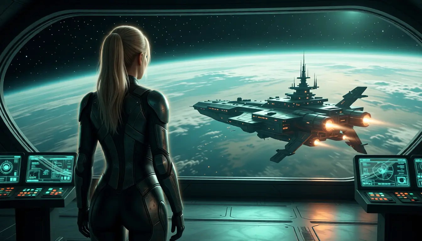 A cinematic, highly detailed sci‑fi scene of a lone woman in a form‑fitting futuristic suit standing on a massive observation deck, viewed over‑the‑shoulder as she gazes out at a vast planet and a colossal battle carrier drifting in orbit; the suit shows realistic seams, armored panels, subtle wear, and a high ponytail silhouette, soft rim light outlining her figure; expansive curved viewport revealing a cloud-covered planet with a sharp terminator line, distant stars, and a multi‑layered capital ship with spires, docking arms and glowing thrusters; foreground control consoles and holographic displays cast teal and amber reflections across metallic floors; volumetric lighting, soft atmospheric haze, subtle film grain, ultra‑realistic textures, photoreal render, dramatic scale and depth, balanced cool teal/green palette with warm highlights, cinematic composition, shallow depth of field with crisp detail on the suit and console edges, epic, moody, immersive.