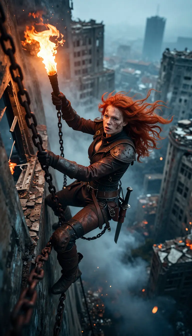 A hyper-detailed cinematic sequence depicts a fierce red-haired woman clambering up a heavy, rusty chain hanging along the façade of a ruined building, high above a shattered city. Her wind-blown hair blazes like fire, and dirt and grime are smeared across her determined face. She holds a flaming orange flare, casting a warm, dramatic glow and backlighting across her rough leather armor, harness, kneepads, gloves, and harness belts, and a small combat knife is tucked at her hip. Volumetric smoke, floating sparks, and smoldering embers swirl around her, falling past shattered windows and crumbling concrete towers in the misty, cold blue distance. Dynamic top-down perspective, wide-angle lens, strong diagonal composition with the chain as a leading line, shallow depth of field, background motion blur, ultra-realistic textures, high-contrast cinematic color grading, film grain, intense facial expressions, survivalist mood, epic action concept art, 8K detail, dramatic shadows and highlights, dark post-apocalyptic atmosphere.