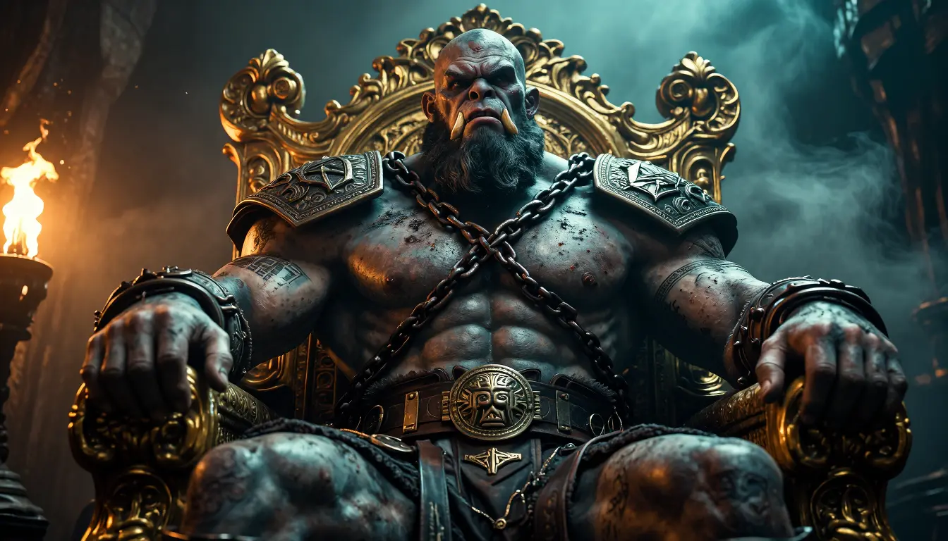 Massive warlord ogre king seated on an ornate golden throne, imposing low-angle composition, hulking muscular body with pale bluish-gray skin, deep battle scars, coarse black beard, protruding tusks and fierce grimace; heavy rusted chains and battered leather straps cross his broad chest, intricate metal plates and carved symbols on pauldrons, worn belt with runic buckle, weathered tattoos and ritual scars on arms and torso; hyper-detailed skin pores, veins, and grime, realistic subsurface scattering and specular highlights; dramatic cinematic lighting with warm torch glow from the left and cool rim light from the right, volumetric fog and particles in background, shallow depth of field focusing on the face and hands, richly detailed throne carvings, ornate filigree and aged patina, high-resolution photorealistic fantasy art, gritty texture, high contrast color grading with teal and amber tones, moody atmospheric cinematic scene, ultra-detailed, high fidelity, 8k feel.