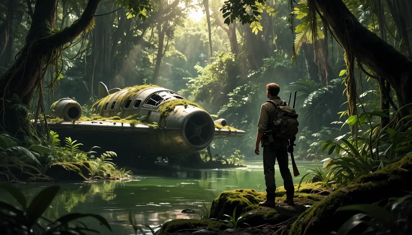 VISUAL STYLE: A digital painting with a cinematic, epic adventure feel. The color palette is dominated by rich greens and earthy browns with golden highlights from the sunlight. The atmosphere is mysterious, exploratory, and slightly melancholic due to the broken equipment. The composition is wide, with the aircraft as the central element on the left and the explorer on the right, creating a sense of scale and human presence. The lighting is dramatic, with strong chiaroscuro effects and shafts of light penetrating the jungle. The image style is painterly and detailed, with an emphasis on texture and atmospheric perspective, reminiscent of concept art for sci-fi adventure films. Shot with a wide-angle lens, with a low angle of view and shallow depth of field to emphasize foreground elements. --ar 16:9 --v 5.2 --q 2