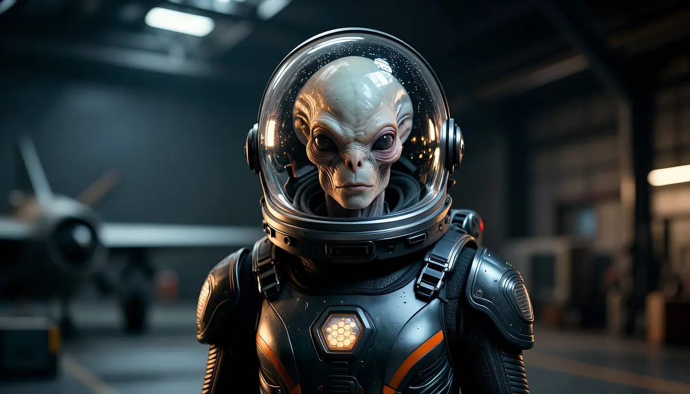 A photorealistic, cinematic portrait of an alien diplomat in a sleek armored environmental suit: waist-up, centered, three-quarter frontal view inside a dim industrial hangar. The alien has a pale, ridged skull with deep-set, intelligent eyes, textured skin with subtle veins and translucent quality; delicate facial folds visible through a clear hemispherical helmet that shows realistic glass reflections, condensation and inner rim lighting. The suit is matte black and gunmetal with smooth organic curves, orange accent stripes, illuminated hexagonal chest panel, tactile buttons, visible seams, micro-scratches and brushed metal hardware. Soft volumetric overhead light and warm amber rim highlights create contrast against cool blue ambient shadows; shallow depth of field, soft bokeh hangar background with blurred aircraft silhouettes and structural beams. Emphasize ultra-detailed surface textures, specular highlights, subsurface scattering on skin, believable reflections on the helmet, cinematic color grading, high resolution, dramatic yet contemplative mood.