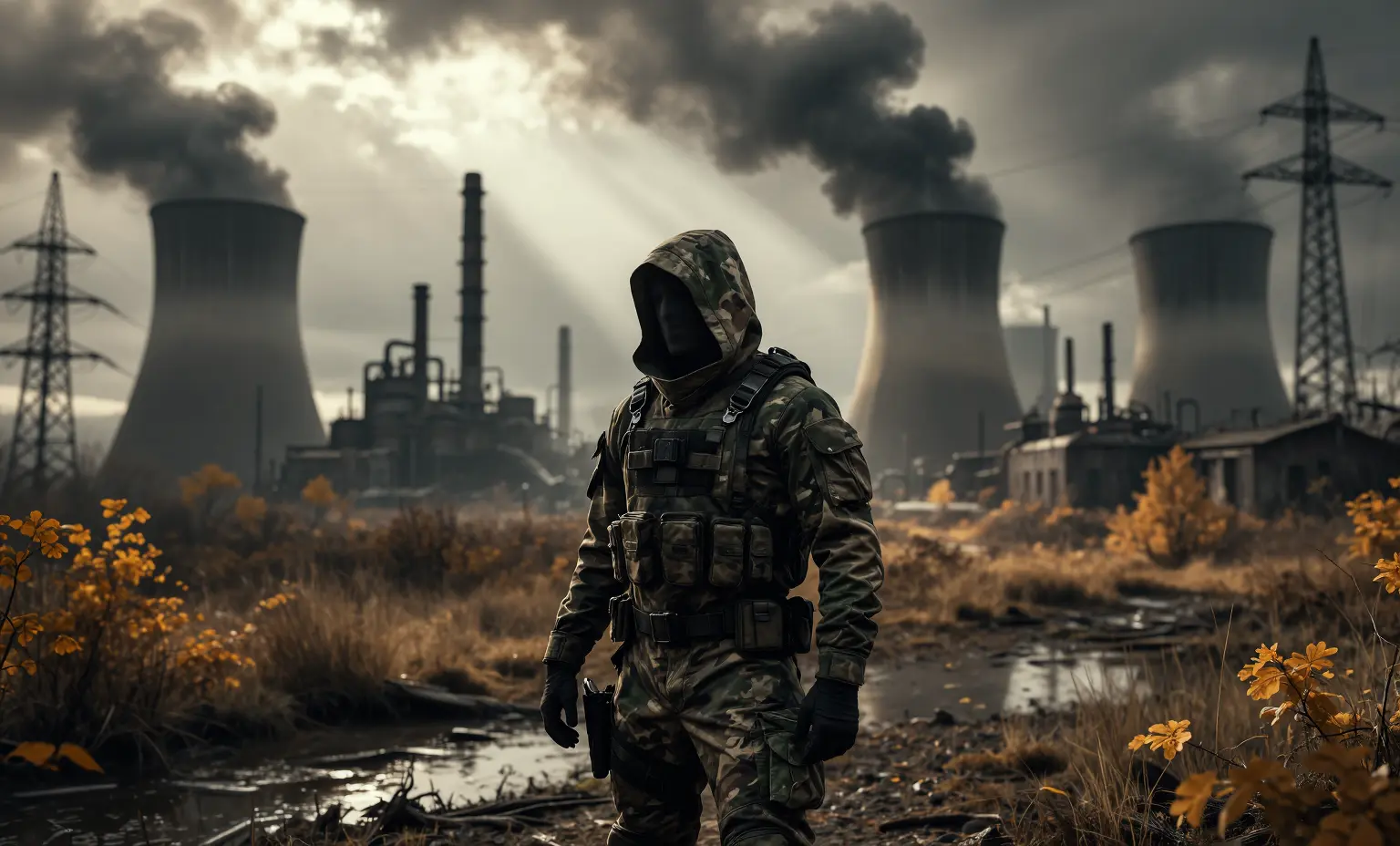 A lone figure in tactical gear, camouflaged and hooded, stands in the foreground. Behind them, a desolate landscape unfolds with dry, autumnal foliage and muddy, waterlogged ground. In the mid-ground, a sprawling industrial complex features cooling towers emitting thick plumes of dark smoke, alongside high-voltage electrical towers. The overall mood is somber and post-apocalyptic, with a gritty, realistic aesthetic reminiscent of survival horror games or grimdark fantasy art. The lighting is dramatic and atmospheric, with an overcast sky and shafts of muted sunlight piercing through heavy clouds, casting long shadows and highlighting the textures of the environment. The color palette is dominated by earthy browns, muted greens, grays, and ochres, creating a sense of decay and desolation. The composition places the heavily detailed human subject slightly off-center, drawing the viewer's eye towards the imposing industrial backdrop. A low-angle shot emphasizes the scale of the structures and the solitary nature of the protagonist. Photographically, the image features a shallow depth of field, blurring the background slightly to keep the focus on the figure. The style is photorealistic with a cinematic feel, akin to a still from a high-budget dystopian film.