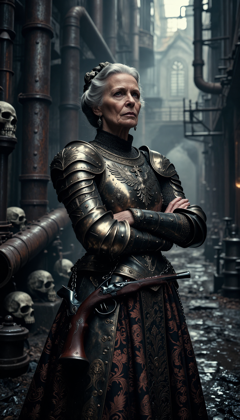 A dramatic, photorealistic three-quarter portrait of a stern, dignified older woman standing in a grim, gothic industrial alley; she wears ornate dark bronze and leather ceremonial armor with filigree and winged eagle motifs, layered over a rich brocade gown with intricate floral patterns. Her silver-streaked hair is swept into an elegant updo with decorative pins, she wears antique drop earrings, and her arms are crossed confidently. A polished flintlock-style pistol in an engraved leather holster hangs at her hip, chains and metal studs accent armor plates and pauldrons. Background: towering rusted pipes, steam vents, skulls and riveted machinery, fog and drifting smoke, narrow vertical architecture receding into depth. Lighting: moody cinematic rim and key light, high contrast, cool desaturated palette with warm brass highlights, subtle film grain, deep shadows and volumetric light beams. Emphasize hyper-detailed textures: metal patina, worn leather grain, embroidered fabric, skin pores and fine wrinkles, realistic reflections, dramatic atmosphere, ultra-detailed, 8k, cinematic realism.