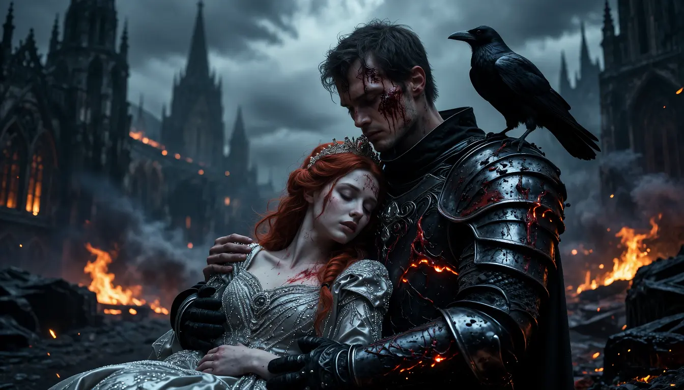 A dark fantasy cinematic scene of a brooding black-armored warrior cradling a wounded red-haired princess against a burning gothic city backdrop, the knight’s armor appearing charred and organic with glowing ember veins and ash-scarred texture, a raven perched on his shoulder, his face grim and streaked with soot and blood; the princess wears an ornate beaded silver gown and delicate tiara, her skin pale, smeared with blood and dust, eyes closed, limp and fragile in his arms; towering ruined cathedral spires and smoldering fires fill a smoky sky, drifting ash and glowing embers swirl around them; dramatic low-key rim lighting, high contrast, cool desaturated blues offset by warm orange embers, ultra-detailed skin pores, fabric beads, blood splatter, soot, realistic wet sheen, cinematic depth of field, volumetric smoke, photoreal, high resolution, epic tragic romantic mood, epic composition, close-up to mid-shot, highly detailed textures and moody atmosphere.