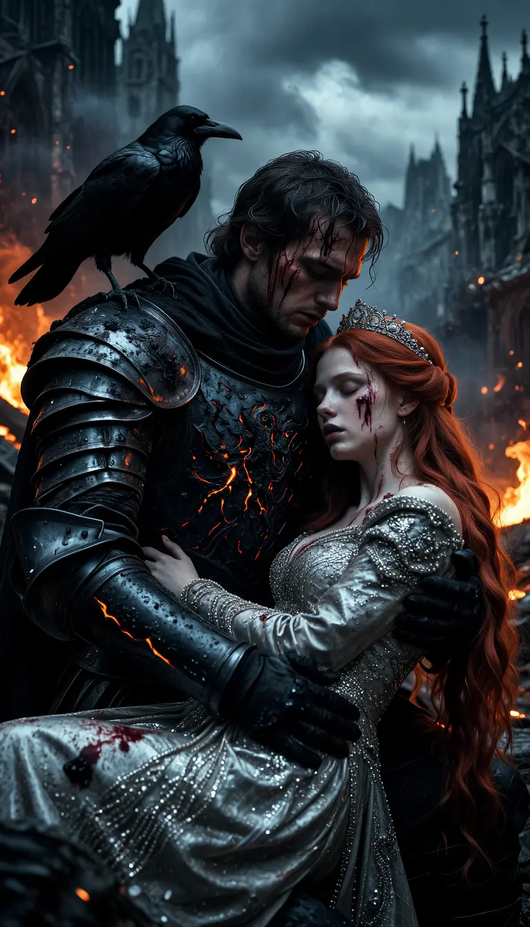 A dark fantasy cinematic scene of a brooding black-armored warrior cradling a wounded red-haired princess against a burning gothic city backdrop, the knight’s armor appearing charred and organic with glowing ember veins and ash-scarred texture, a raven perched on his shoulder, his face grim and streaked with soot and blood; the princess wears an ornate beaded silver gown and delicate tiara, her skin pale, smeared with blood and dust, eyes closed, limp and fragile in his arms; towering ruined cathedral spires and smoldering fires fill a smoky sky, drifting ash and glowing embers swirl around them; dramatic low-key rim lighting, high contrast, cool desaturated blues offset by warm orange embers, ultra-detailed skin pores, fabric beads, blood splatter, soot, realistic wet sheen, cinematic depth of field, volumetric smoke, photoreal, high resolution, epic tragic romantic mood, epic composition, close-up to mid-shot, highly detailed textures and moody atmosphere.
