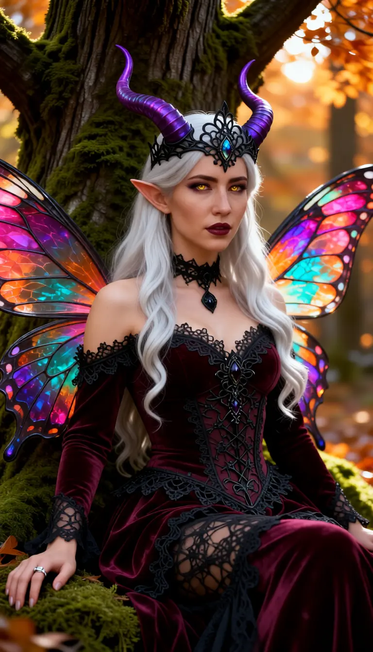 A hyperreal, cinematic portrait of a fantasy fae-demon woman seated against a mossy tree in an autumn forest, three-quarter pose, eye-level view, slightly turned toward the camera, hand resting on the trunk showing a delicate ring; long flowing silver-white hair cascading over velvet burgundy off-shoulder gown embroidered with black lace, intricate textures and velvet sheen emphasized, sultry deep red lips, smoky magenta eyeshadow, pale flawless skin with natural pores, high-detail facial features, pointed elven ears, ornate black choker and forehead jewel, curved ridged purple horns adorned with small crystalline accents, translucent iridescent wings with vibrant magenta, purple and teal gradients catching the light; soft golden-hour rim and volumetric light filtering through trees, shallow depth of field with creamy bokeh, rich autumnal background, moody atmospheric color grading, ultra-detailed fabric lace and horn texture, dramatic yet elegant fantasy mood, photorealistic, high resolution, finely detailed, painterly realism.