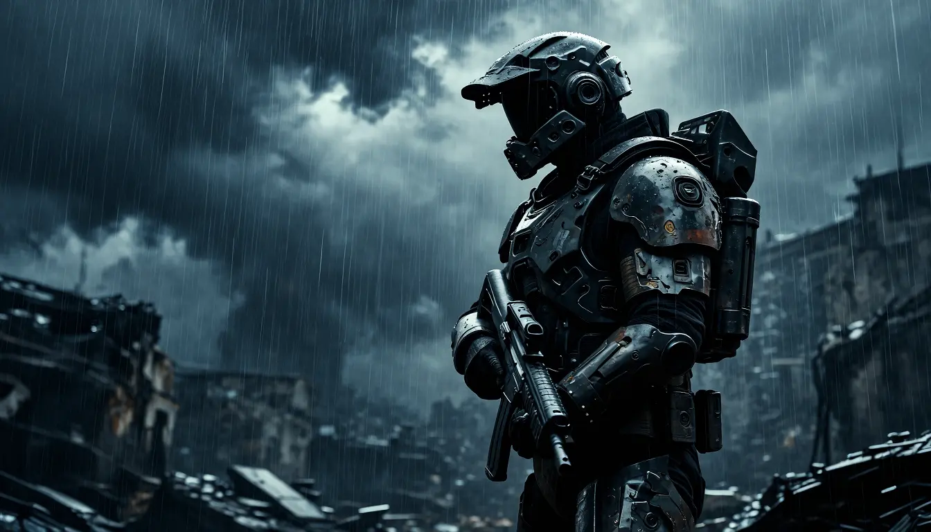 A lone ODST soldier in futuristic armor stands stoically in heavy rain, holding a combat rifle. The scene is dark and gritty, with a somber, apocalyptic mood. The color palette is dominated by deep blues, grays, and blacks, with hints of metallic sheen on the armor. Rain streaks heavily across the frame, obscuring a decaying urban background with ominous clouds overhead. The composition is a medium close-up, focusing on the soldier's profile and their imposing silhouette against the dismal environment. The style is photorealistic with a cinematic flair, reminiscent of sci-fi concept art. Lighting is dramatic and atmospheric, with the rain creating highlights and shadows, enhancing the sense of isolation and danger. The image conveys a feeling of resilience and determination in the face of adversity. --ar 16:9 --style raw --chaos 10 --v 6.0
