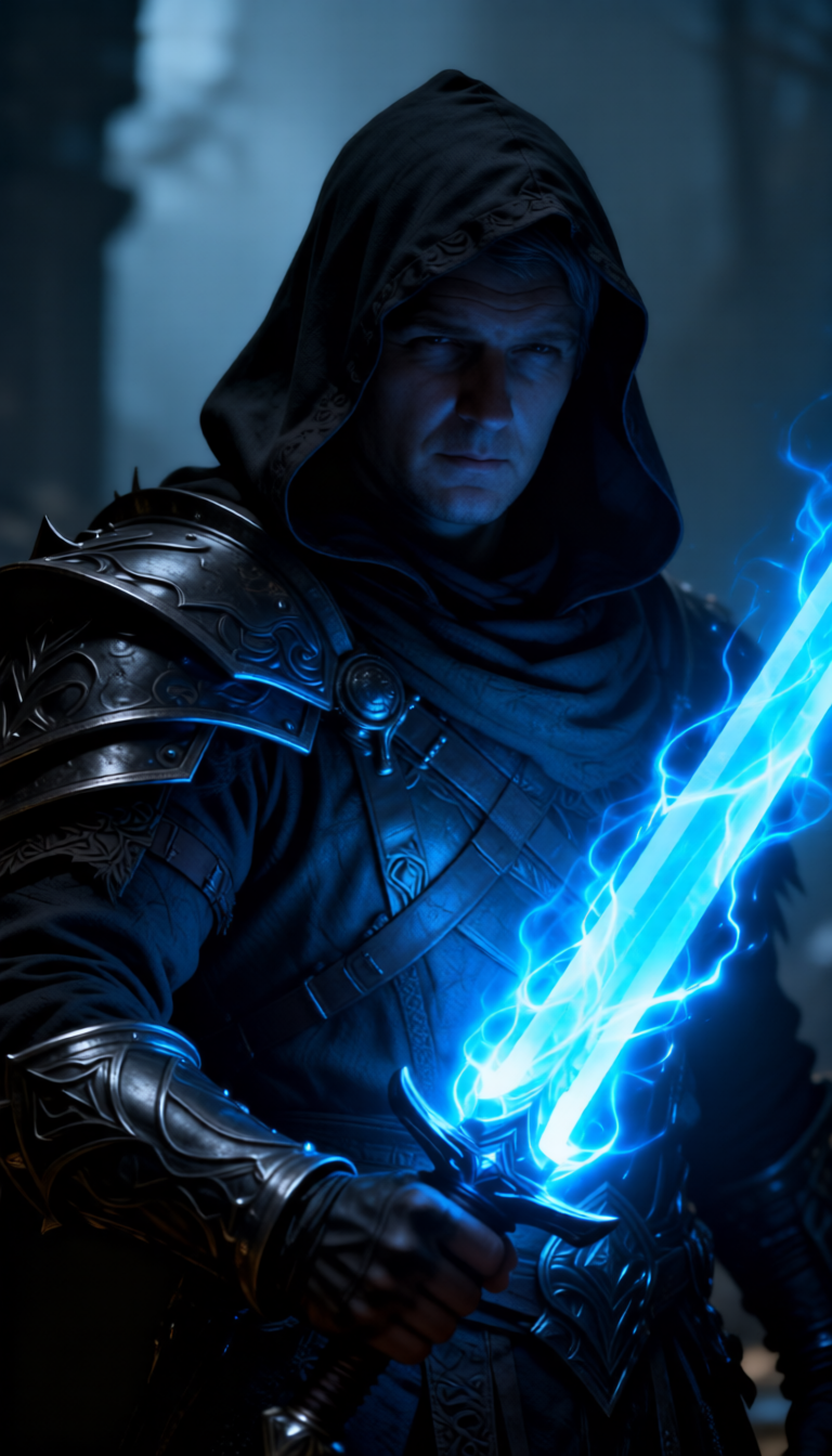 A shadowy figure, cloaked and hooded, holding a glowing blue energy sword. The style is dark fantasy, with a sense of mystery and power. The lighting is dramatic and atmospheric, with the sword casting a vibrant blue light on the figure and the surrounding environment. The mood is intense and foreboding. The composition is a close-up shot, focusing on the figure and the sword, with the background slightly blurred. The colors are dominated by deep blues, blacks, and grays, with the bright blue of the sword providing a striking contrast. The image has a high level of detail, with intricate textures on the cloak and armor, and the energy effects on the sword are rendered with precision. The overall aesthetic is that of a cinematic fantasy illustration, reminiscent of concept art for a dark fantasy video game or film. --ar 2:3 --style raw --v 5.2
