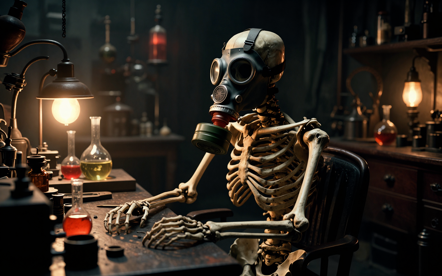 A skeleton wearing a vintage gas mask, seated at a workbench in a dimly lit, cluttered laboratory. The scene has a dark, moody, and slightly unsettling atmosphere, rendered in a highly detailed, photorealistic style with elements of steampunk and gothic art. Warm, atmospheric lighting emanates from industrial-looking lamps and glass beakers filled with glowing liquids, casting long shadows and highlighting the textures of bone, metal, and old wood. The color palette is dominated by deep browns, muted grays, and pops of warm amber and red. The composition is a medium shot, focused on the skeleton's upper body and hands, with a shallow depth of field that blurs the background laboratory equipment, emphasizing the central subject. Think of the aesthetic of H.R. Giger meets a Victorian inventor's workshop. High detail, 8k resolution, cinematic lighting, dramatic contrast.