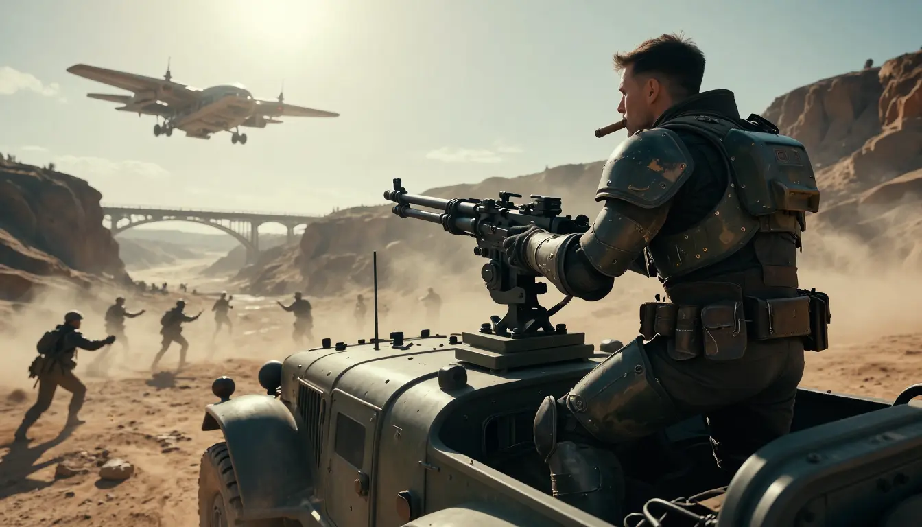 A soldier in heavy, futuristic armor, with a cigar in his mouth, mans a mounted heavy machine gun on the back of a rugged, open-top military vehicle. The scene unfolds in a dusty, arid landscape under a bright, hazy sun, with a futuristic aircraft flying overhead. In the distance, a bridge spans a canyon, and a group of figures engage in combat. The overall mood is action-packed and intense, with a gritty, war-torn aesthetic. The color palette is dominated by earthy browns, tans, and muted greens, accented by the bright sun and the cool metallic tones of the vehicles and armor. The composition is dynamic, with the soldier and his weapon filling the foreground, drawing the viewer's eye into the chaotic battle. The lighting is harsh and atmospheric, casting long shadows and creating a sense of heat and dust. This image is rendered in a realistic, cinematic style, reminiscent of high-quality video game cutscenes. --ar 16:9 --v 5.2 --style raw