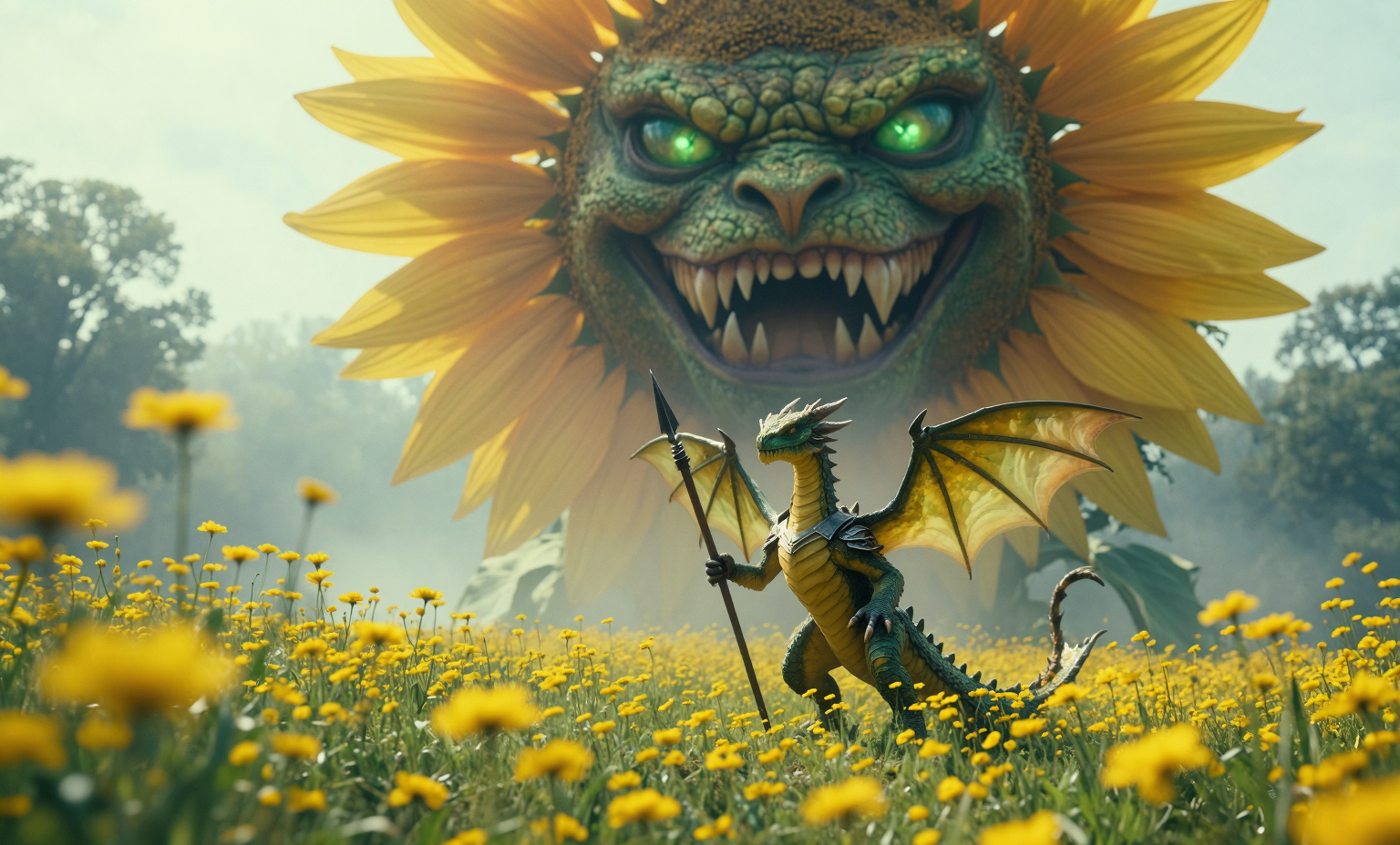 A small, armored dragon with yellow-green scales and translucent wings stands in a field of vibrant yellow wildflowers, holding a spear. Towering above and behind the dragon is a colossal, monstrous sunflower with a fierce, toothy grin and glowing green eyes, its petals a riot of yellow and green. The scene is bathed in soft, ethereal light, with a misty, dreamlike atmosphere that blurs the background trees. The composition is dynamic, with the dragon in the foreground and the giant sunflower looming menacingly, creating a sense of epic confrontation. The overall mood is fantastical and slightly ominous, yet beautiful due to the bright floral setting and soft lighting. Shot with a wide-angle lens from a low angle, a shallow depth of field blurs the foreground and background flowers, emphasizing the central conflict. The art style blends elements of fantasy illustration and surrealism, reminiscent of Arthur Rackham and Roger Dean. Highly detailed, photorealistic, cinematic lighting, 8k resolution, trending on ArtStation.