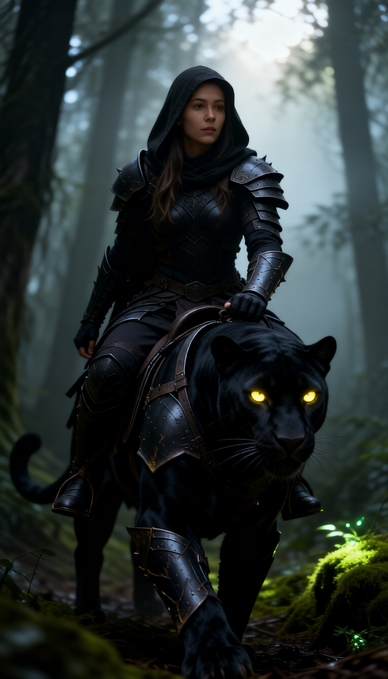 A warrior woman with a hood and dark armor rides a black panther through a dense, misty forest. The panther has glowing yellow eyes and is also adorned with dark, weathered armor. The scene has a dark fantasy, epic, and mysterious mood. The lighting is dim and atmospheric, with a soft, diffused light filtering through the trees, creating deep shadows and highlighting the textures of the armor and fur. The color palette consists of dark greens, grays, and blacks, with accents of yellow from the panther's eyes and small flecks of green from moss and foliage. The composition is a medium shot, focused on the warrior and the panther, with the forest creating a blurred, imposing backdrop. The camera angle is slightly low, emphasizing the power and presence of the figures. The overall aesthetic is reminiscent of dark fantasy art by artists like Brom or Frank Frazetta, with a cinematic and highly detailed rendering. --ar 16:9 --q 2 --style raw