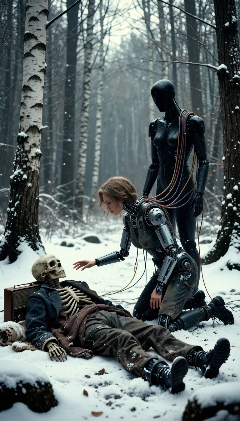 A bionic woman with cybernetic implants kneels in a snow-covered birch forest, reaching out to the skeleton of a dead man in tattered clothes lying in the snow. Next to the skeleton is an antique radio and a rolled-up blanket. Behind the woman stands a tall, faceless, dark, and shiny humanoid figure. The scene is executed in a rough, detailed, painterly style with a dark, post-apocalyptic atmosphere. Soft, diffused daylight filters through the bare trees, casting subtle shadows and illuminating the falling snow. The color palette is muted with cool blues, grays, and whites, contrasting with the warm reds and yellows of the jumper cables. The composition is shot from a low angle, emphasizing the characters and their surroundings. The overall mood is melancholy and exploratory. --ar 16:9 --style raw --v 5.2 --q 2