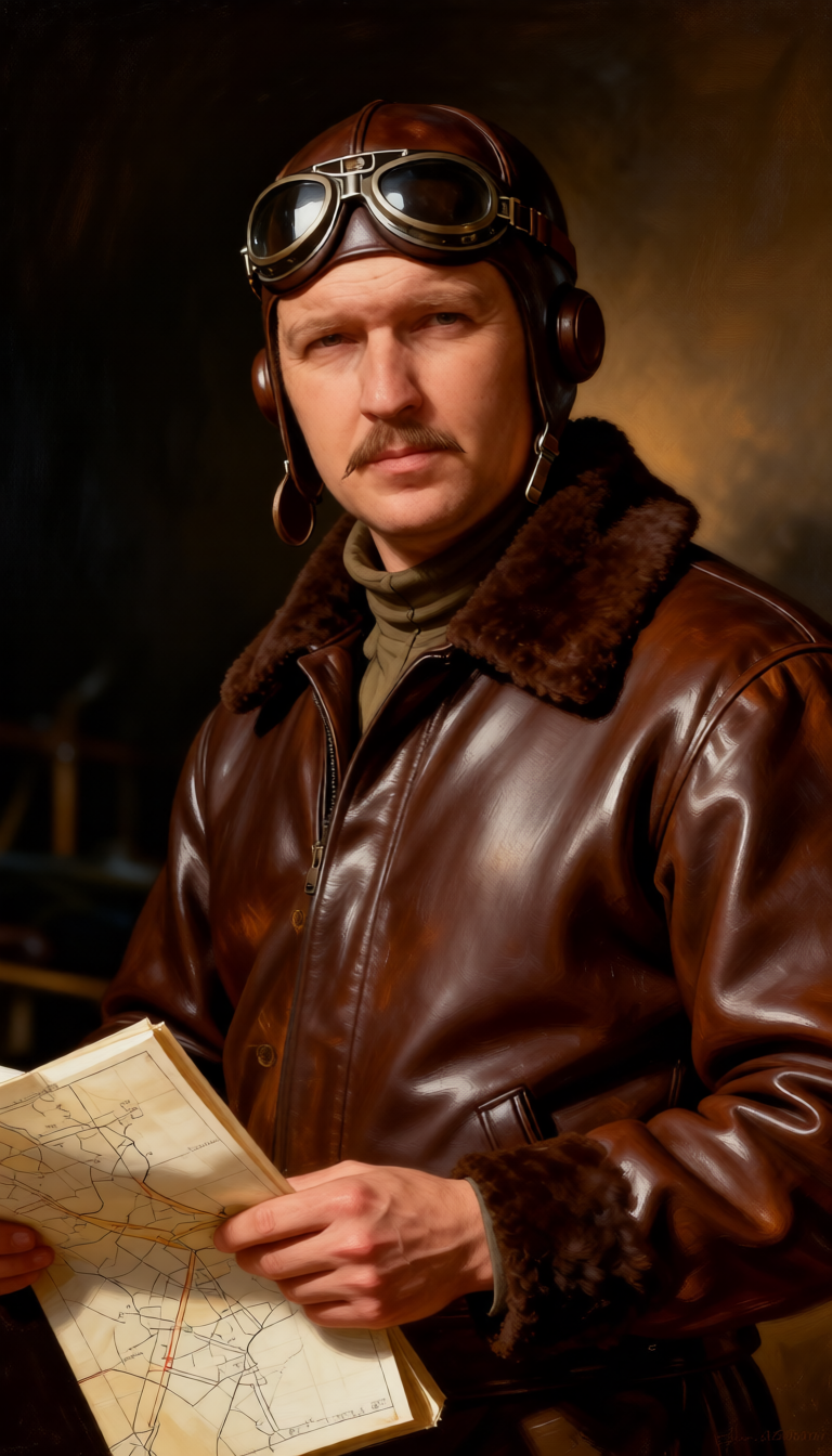 This formal portrait depicts a distinguished young man, a pilot from the early 20th century. He wears a brown leather aviator jacket with a high collar and goggles perched atop a leather cap. A thin mustache adorns his upper lip. He holds a folded topographic map, suggesting a sense of adventure and purpose. The overall style is classical oil painting, characterized by a dramatic, painterly quality. The lighting is chiaroscuro, with a warm, soft light illuminating the subject against a dark, somber background, creating a sense of depth and intensity. The color palette is dominated by rich browns and deep, earthy tones, conveying a sense of vintage elegance and ruggedness. The composition is a medium shot, focusing on the pilot's upper body and arms, with a slightly oblique perspective adding dynamism. The background is blurred, allowing the subject to stand out. The mood is contemplative and heroic, evoking the spirit of the early aviation pioneers. The artistic approach is reminiscent of the works of masters such as John Singer Sargent or William Merritt Chase, known for their virtuoso portraiture and use of light and shadow. The image quality is exceptionally high, with fine detail and a polished, finished look. --v 5.2 --ar 2:3 --style raw
