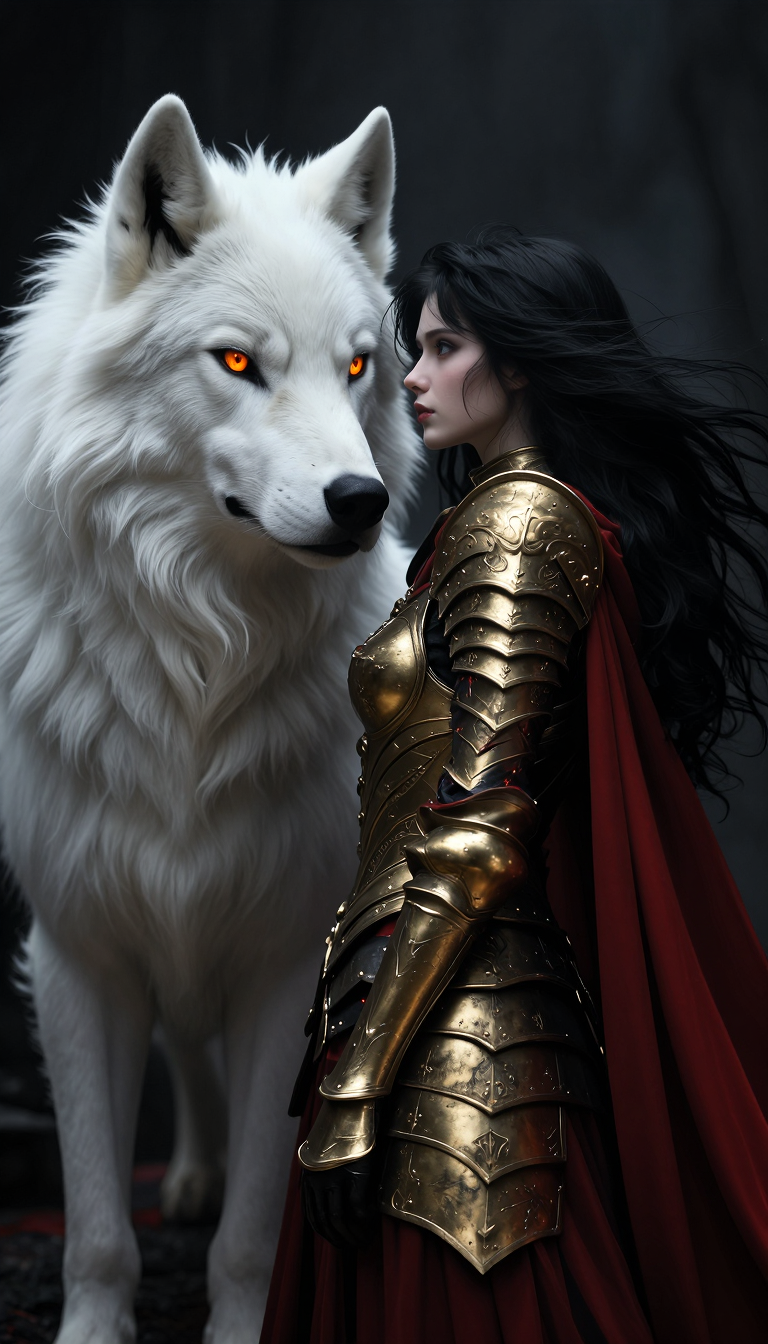 A young woman with dark, flowing hair and intricate golden armor stands beside a magnificent, powerful white wolf with fiery orange eyes. The style is that of dark fantasy illustration with a gothic aesthetic. The atmosphere is dramatic and mysterious, with a soft, ethereal glow illuminating the subjects against a dark, textured background. The color palette is dominated by rich blacks, deep reds of the woman's flowing cape, and the stark white of the wolf's fur, accented by metallic golds. The composition is a close-up, medium shot, with the woman's profile turned towards the wolf, their forms blending together. The lighting is chiaroscuro, with strong contrasts creating a sense of depth and drama. The image evokes a feeling of protective alliance and ancient power. Influences of artists like Yoshitaka Amano and Frank Frazetta can be seen in the stylized rendering and epic feel. --ar 2:3 --v 5.2 --style raw --s 750 --q 2