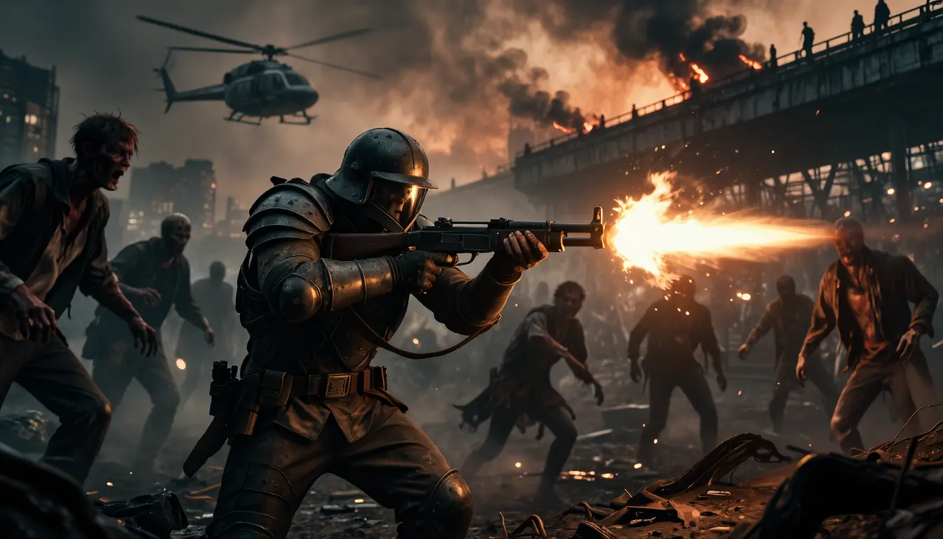 A heavily armored soldier wearing a helmet and visor fires a machine gun, the muzzle flash illuminating the scene in a chaotic post-apocalyptic urban environment. Zombies, their flesh rotting and their clothes tattered, rush forward. A helicopter hovers in the background, and silhouettes of people are visible on a raised platform, perhaps a stadium or a bridge, beneath a smoky, orange sky filled with smoldering embers. The overall style is dark, gritty, and cinematic, reminiscent of a video game or survival horror film. The lighting is dramatic, with strong contrasts between the fire, the muzzle flash, and deep shadows. The color palette is dominated by muted browns, grays, and oranges, creating a mood of desperation and tense conflict. The composition is dynamic, with the soldier and the zombies forming the central conflict, while background elements add depth and context. The camera angle is low, emphasizing the soldier's power and the overwhelming threat of the zombies. A shallow depth of field focuses attention on the immediate action. Highly detailed, photorealistic digital painting, concept art, epic scale, tense action, survival horror, volumetric lighting, dramatic atmosphere.